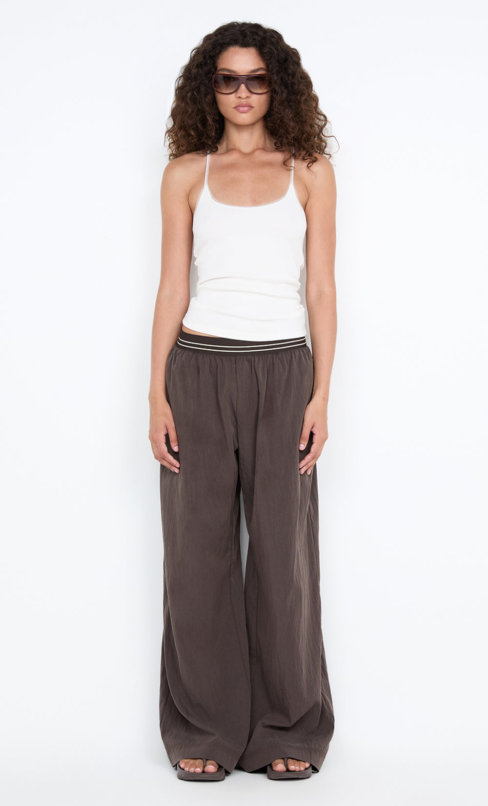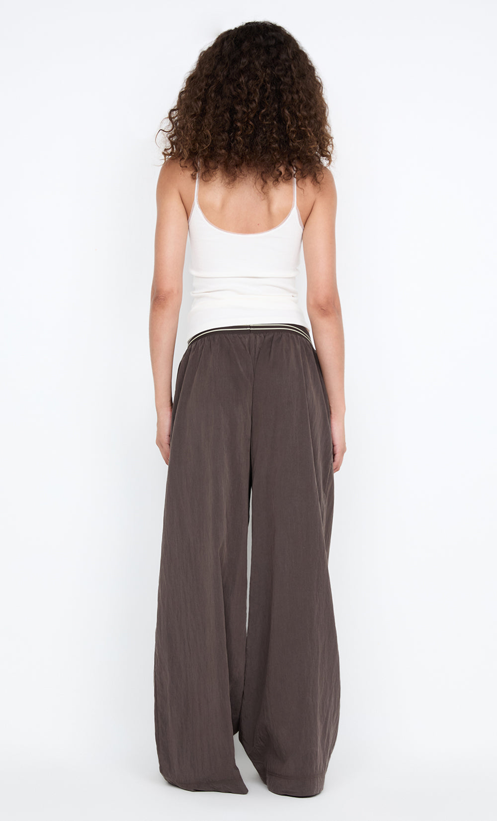 Jerri Wide Leg Pant in Chocolate. These effortless wide-leg pants, feature a custom stripe elastic waistband, offering a chic and comfortable look perfect for elevated holiday styling.