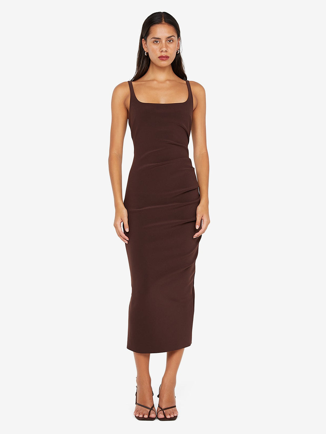 Karina Midi Dress in Dark Chocolate. This timeless brown midi dress is crafted from our signature bonded crepe fabric, creating a flattering, form-fitting dress perfect for any event.