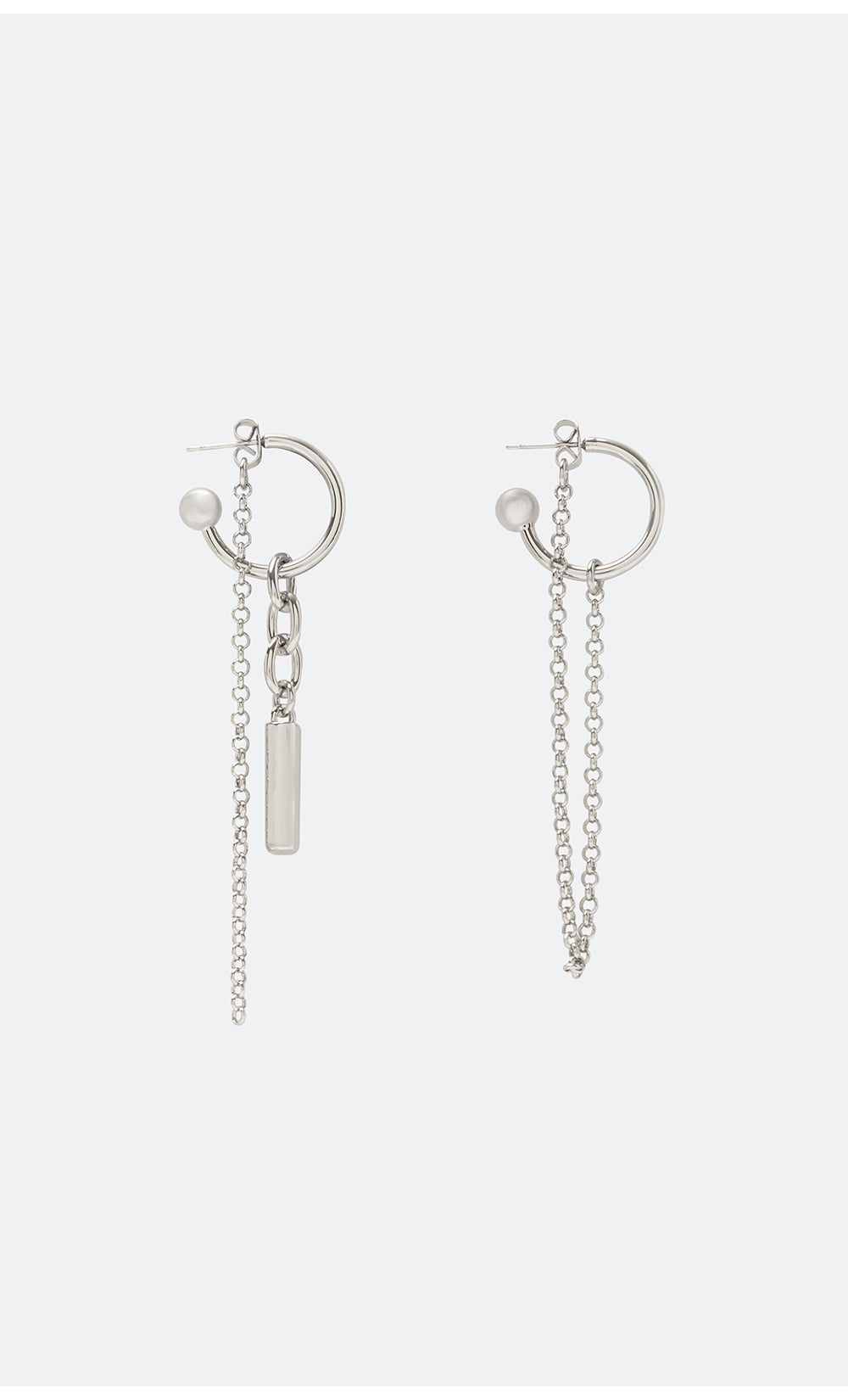 Milly Earrings in Silver. An asymmetrical hoop earring set with chain and charm detailing, designed to elevate everyday looks or finish evening styling.