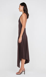 The BEC + BRIDGE Nessie Halter Dress is a sleek and modern silhouette crafted from a stretch jersey in a deep dark chocolate hue. Designed with a halter neckline and V-neck, it features a gathered yoke panel at the waist and flows into an asymmetric midi hem. The low back and raw hem add a contemporary edge, while the fabric's natural stretch ensures a flattering fit.