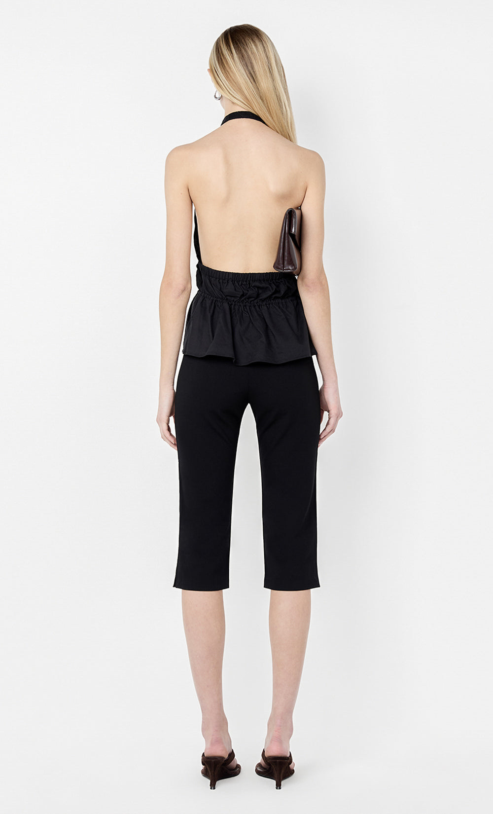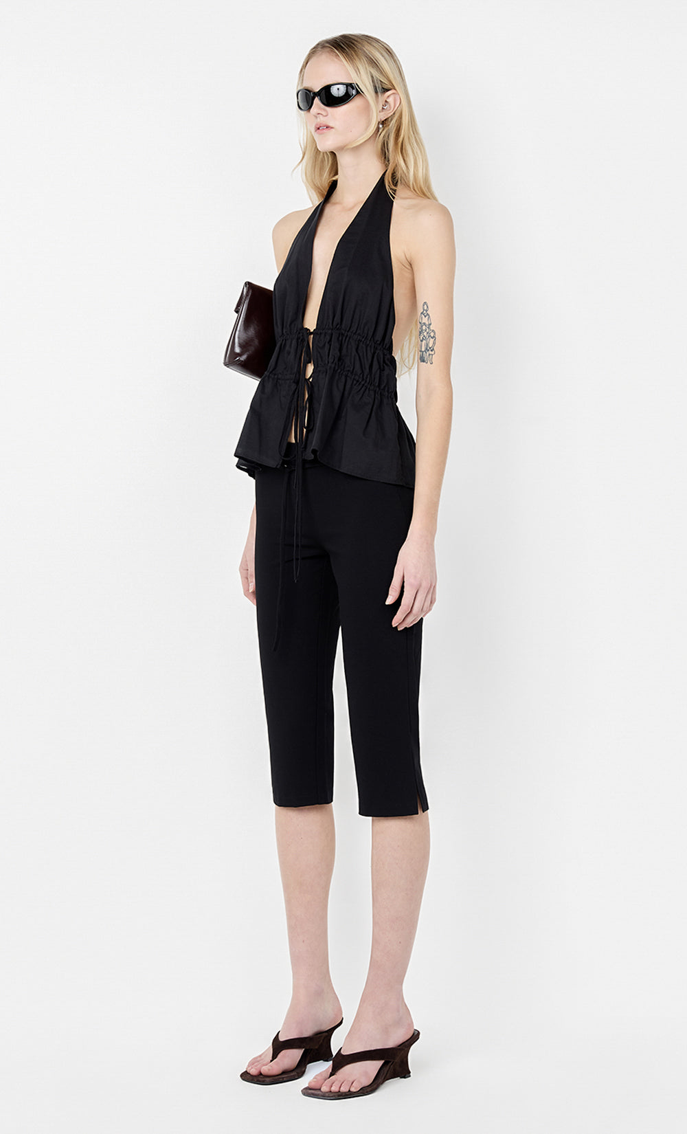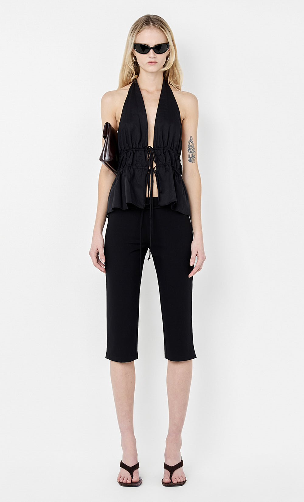 Lynna Halter Top in Black. This elegant black halter top, crafted from lightweight cotton voile, features a flattering gathered drawstring at the waist, creating a sophisticated look perfect for effortless day-to-night styling.