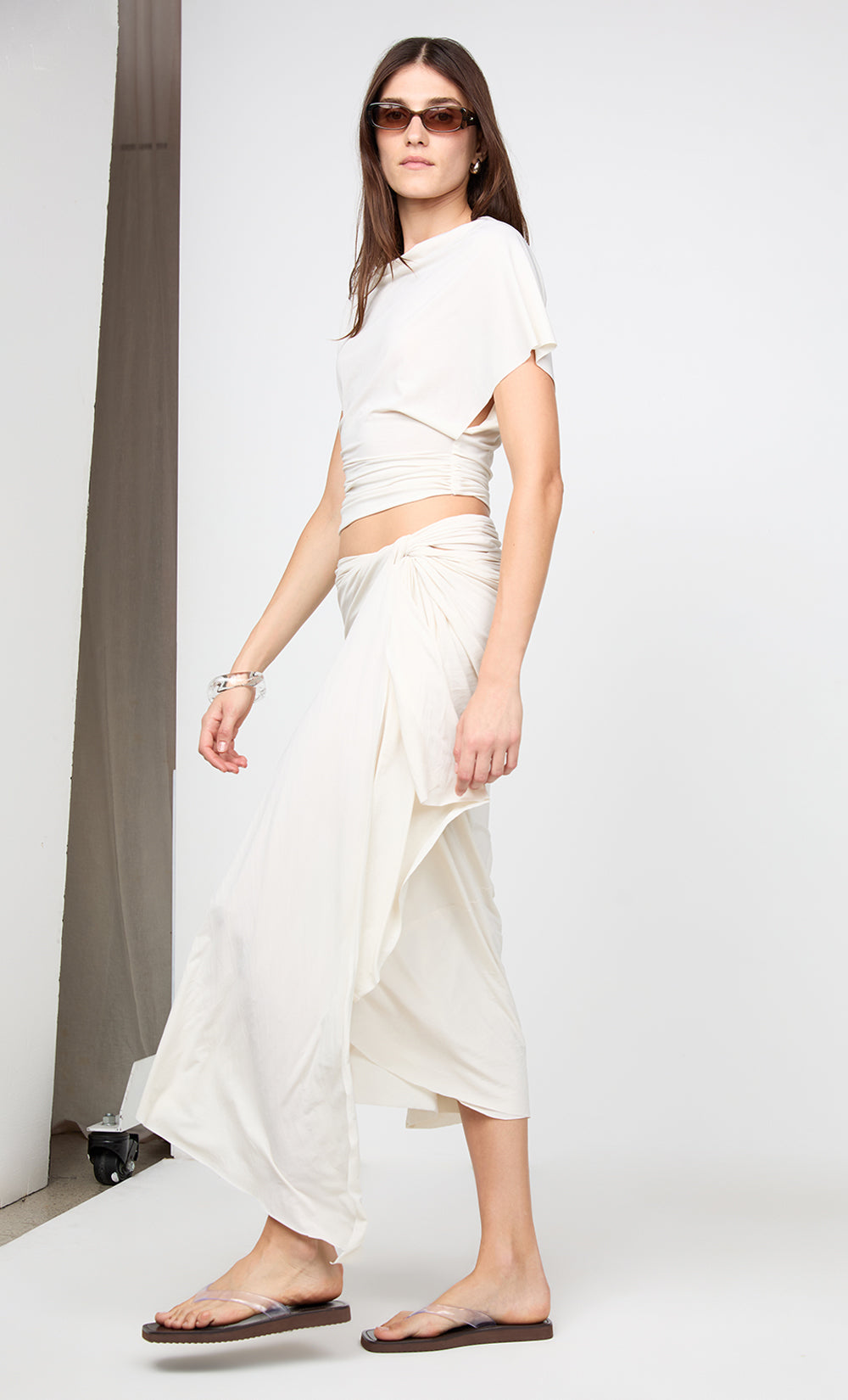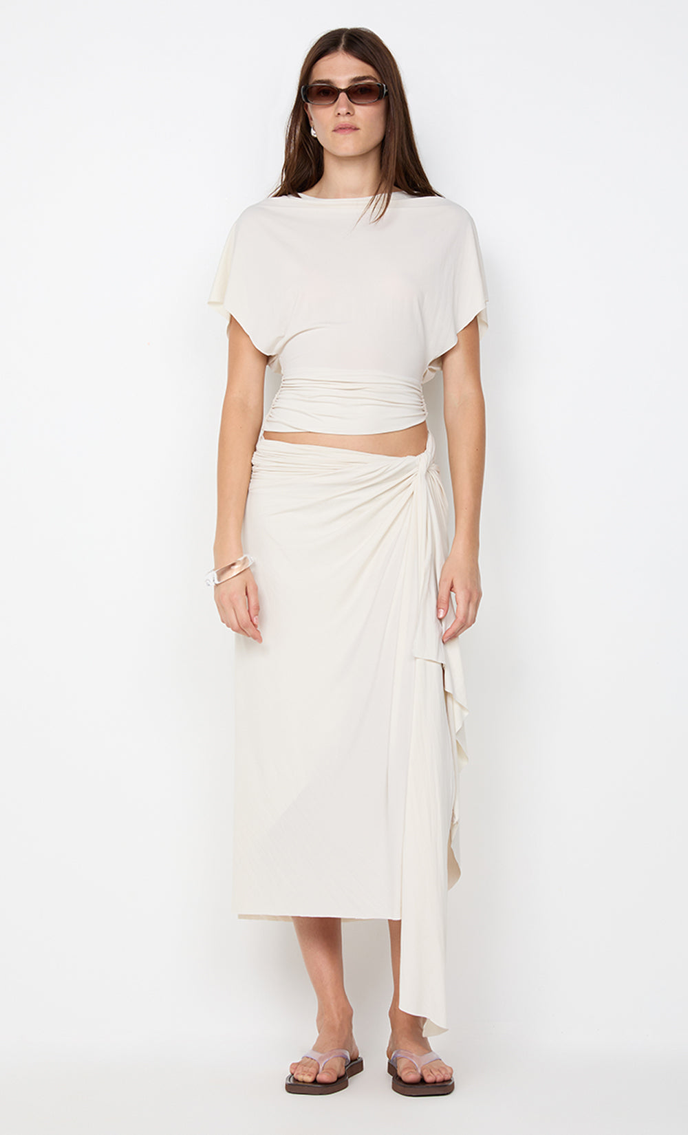 Clementine Drape Skirt in Vanilla. This chic jersey skirt, with its flattering draped silhouette and unique side twist detail, is perfect for a stylish night out or elevated holiday styling.