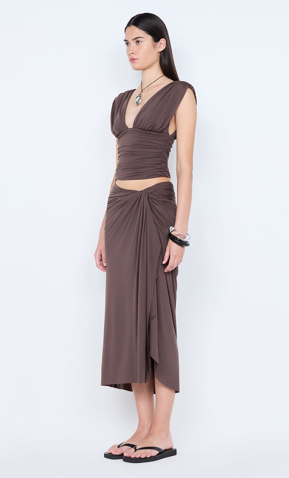 Clementine Gathered Top in Milk Choc. This chic jersey top features a deep V-neckline with a flattering gathered underbust and a fitted waistband, perfect for a night out or elevated holiday styling.