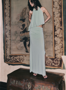 Austen V Neck Maxi Dress in Sage. This elegant maxi dress features a flattering underbust seam and a sleek silhouette, perfect for formal season, a bridesmaid dress, or any sophisticated event.