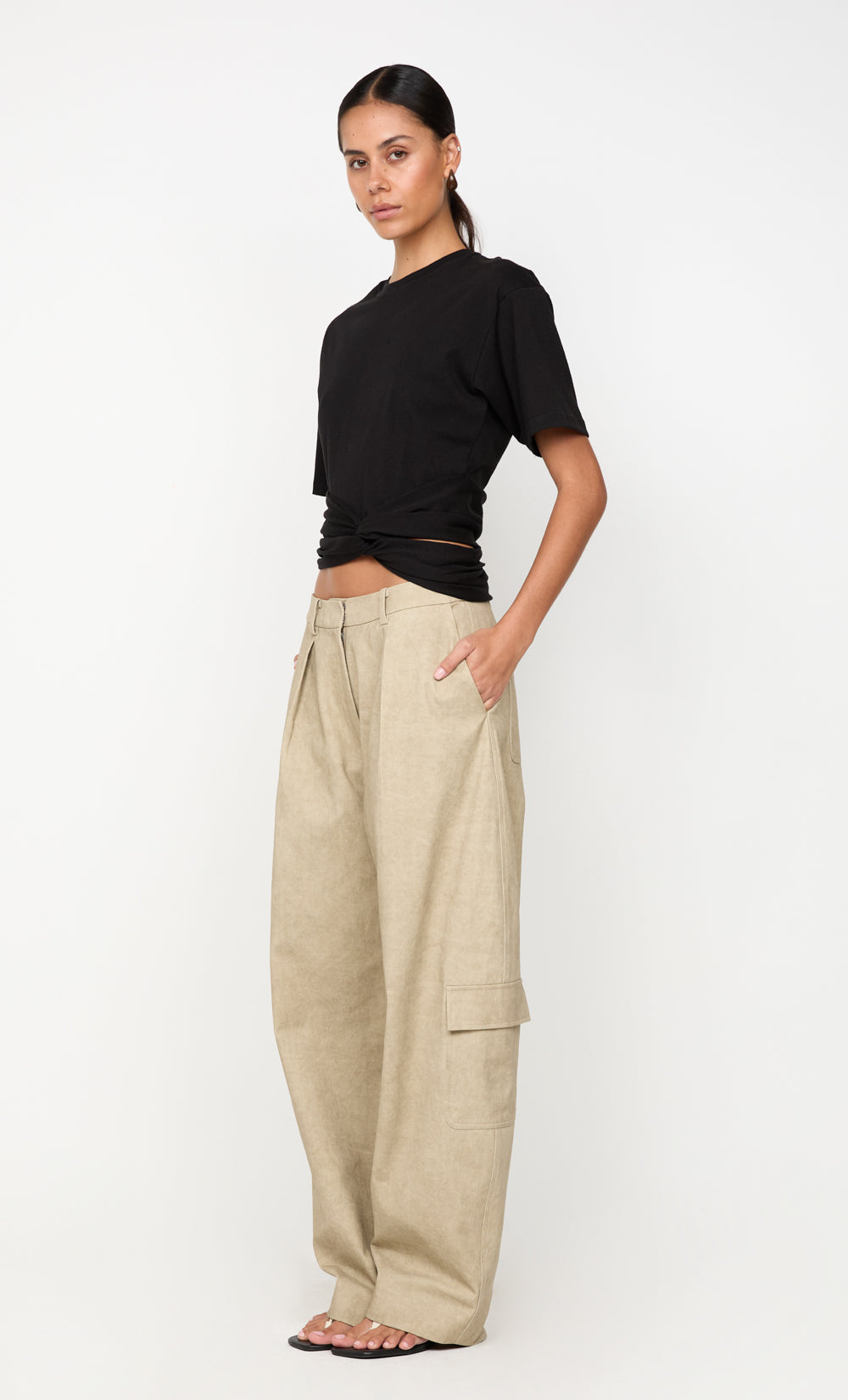 Cyprus Twist Tee in Black. This chic jersey tee, with its relaxed boxy fit and a unique twist detail at the waist, is perfect for a stylish night out or elevated day-to-night styling.