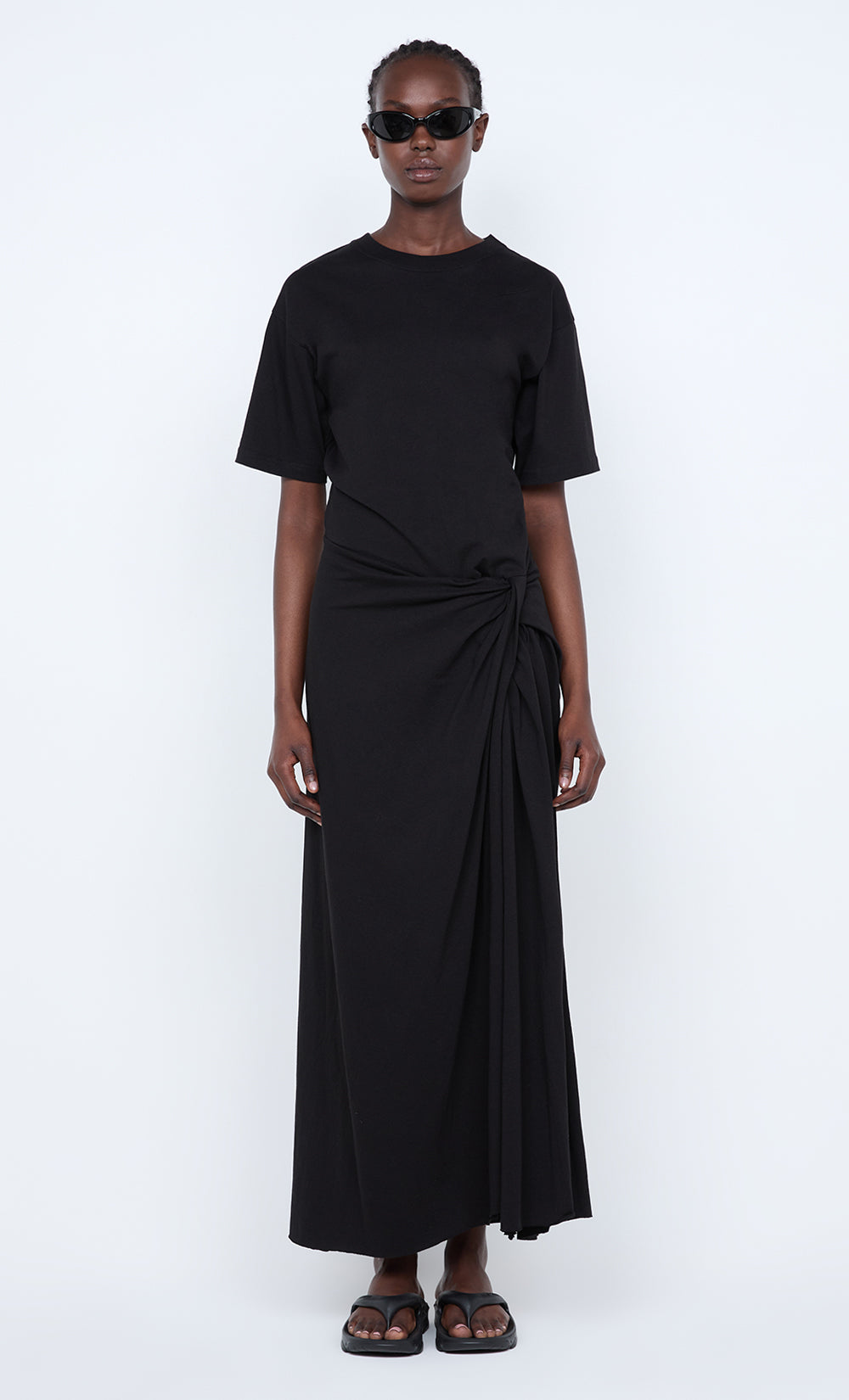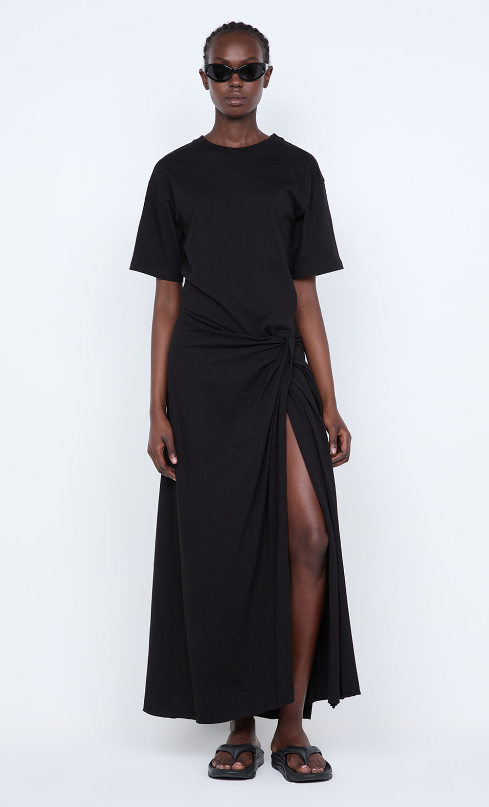 Cyprus Twist Tee Dress in Black. This effortless black tee dress, with its relaxed boxy fit and a unique twist detail at the waist, is perfect for effortless styling.