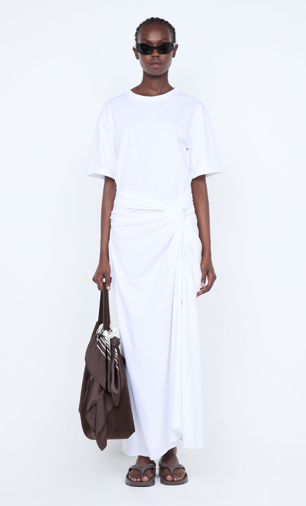 Cyprus Twist Tee Dress in White. This effortless white tee dress, with its relaxed boxy fit and a unique twist detail at the waist, is perfect for effortless styling.