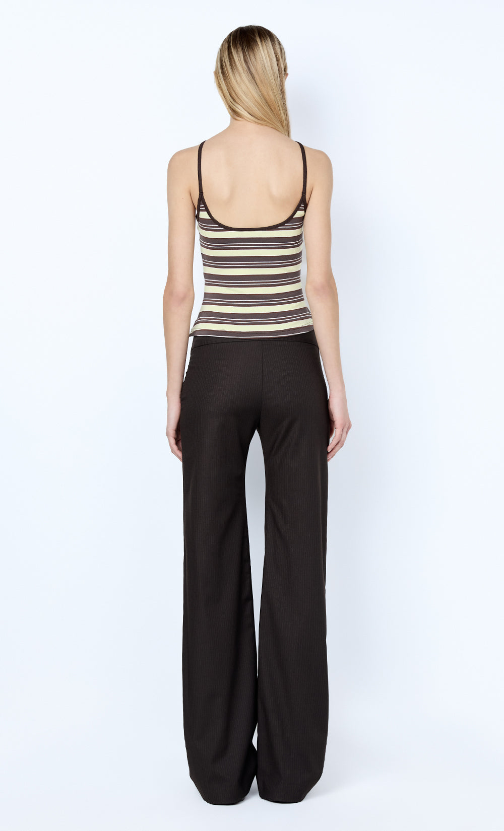 Luna Crossover Tank in Dark Chocolate. This chic halter tank, crafted from a striped jersey, features a flattering scoop back and a fitted silhouette, perfect for effortless day-to-night styling.