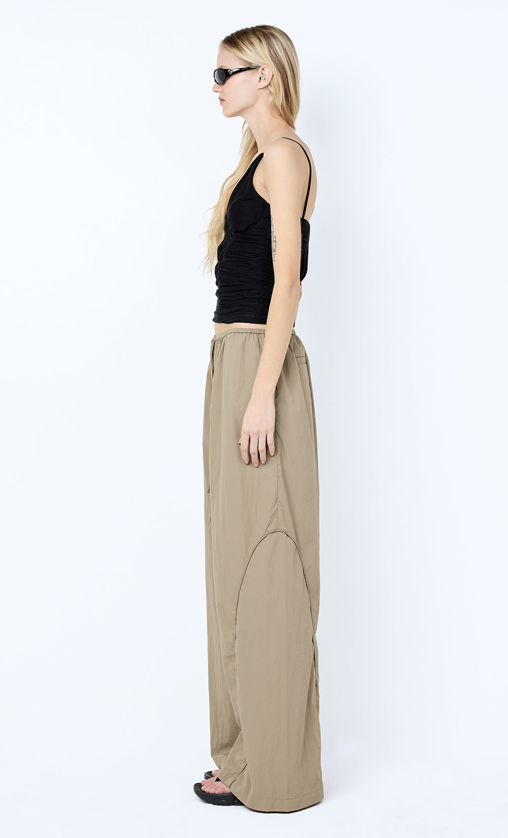 Bastien Pant in Taupe. A sporty wide-leg pant with clean piping details and a relaxed, modern feel. Ideal for everyday wear, office days, or elevated styling.