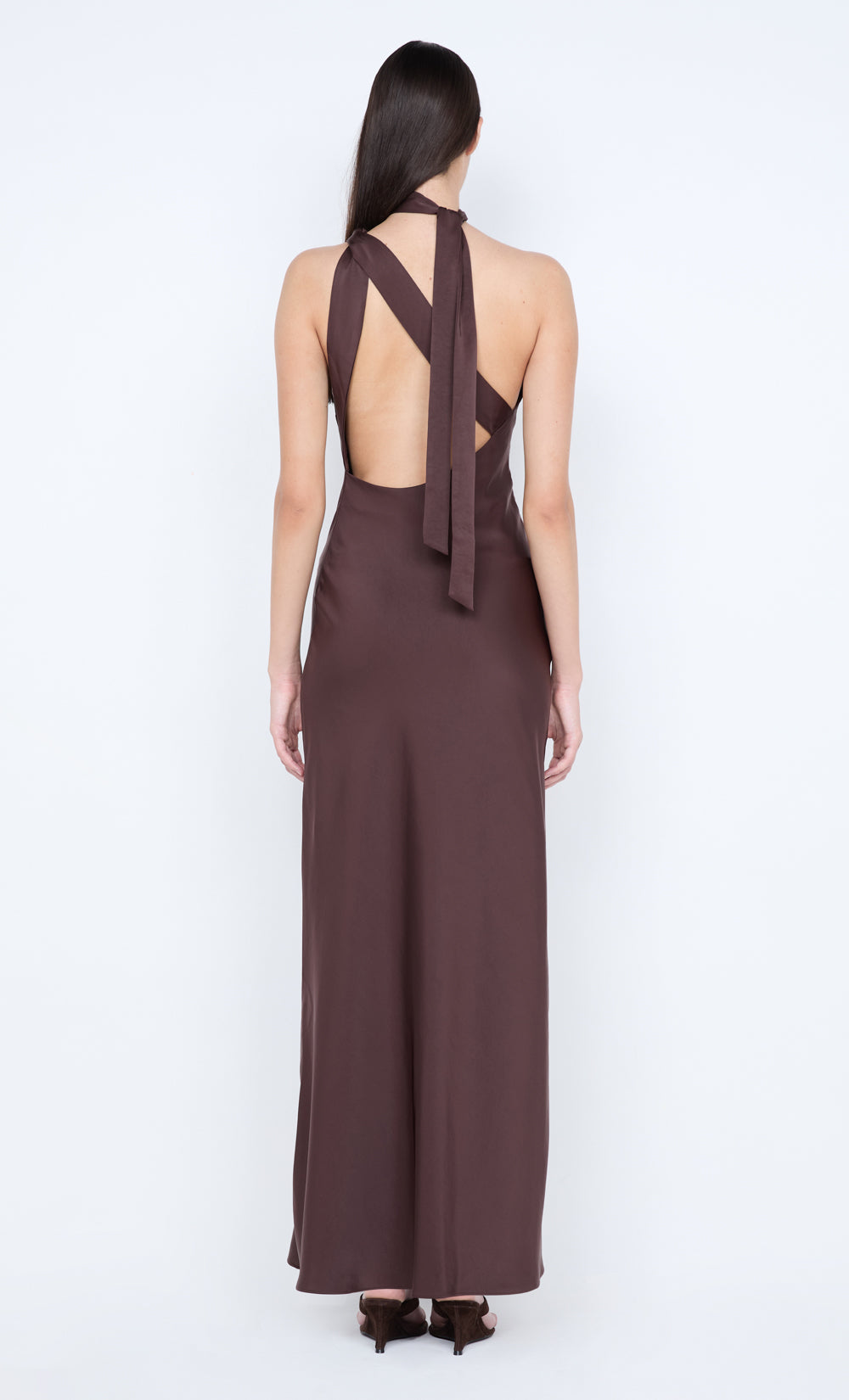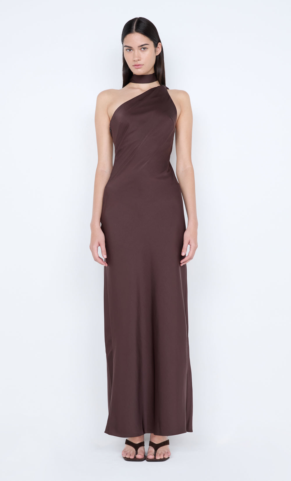 Nyssa Maxi Dress in Dark Chocolate. This elegant asymmetric brown maxi dress features a modern open back and a versatile neck tie, creating a sophisticated silhouette perfect for a night out or an elevated holiday event.
