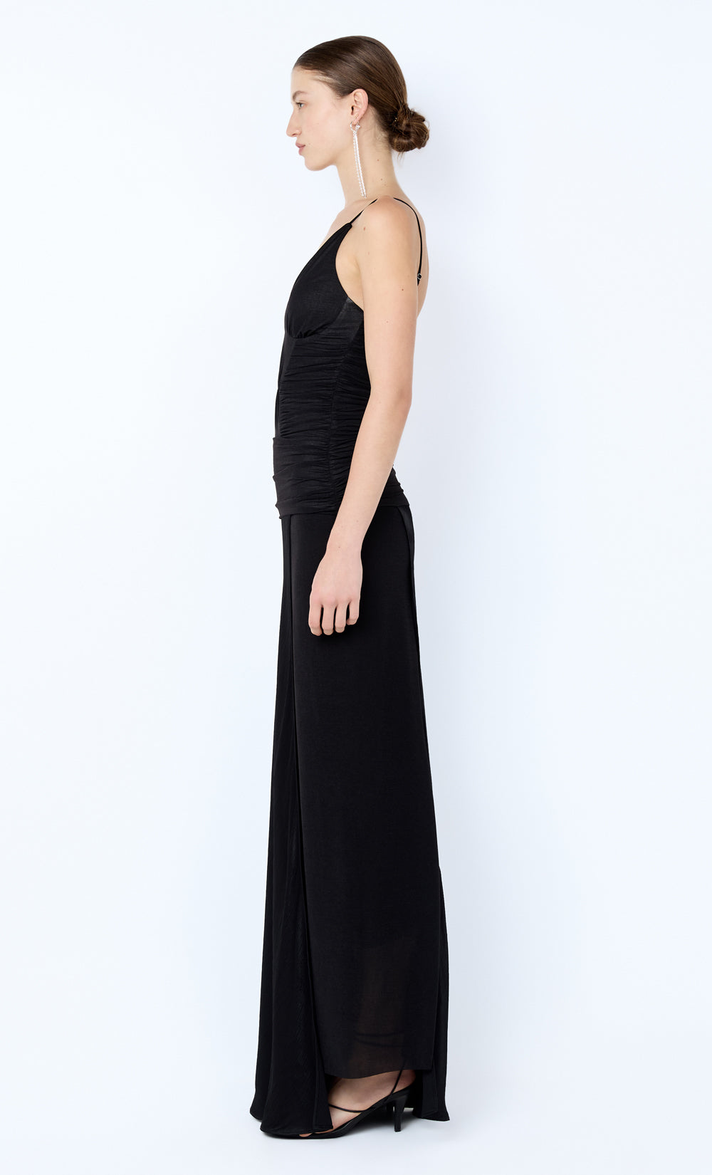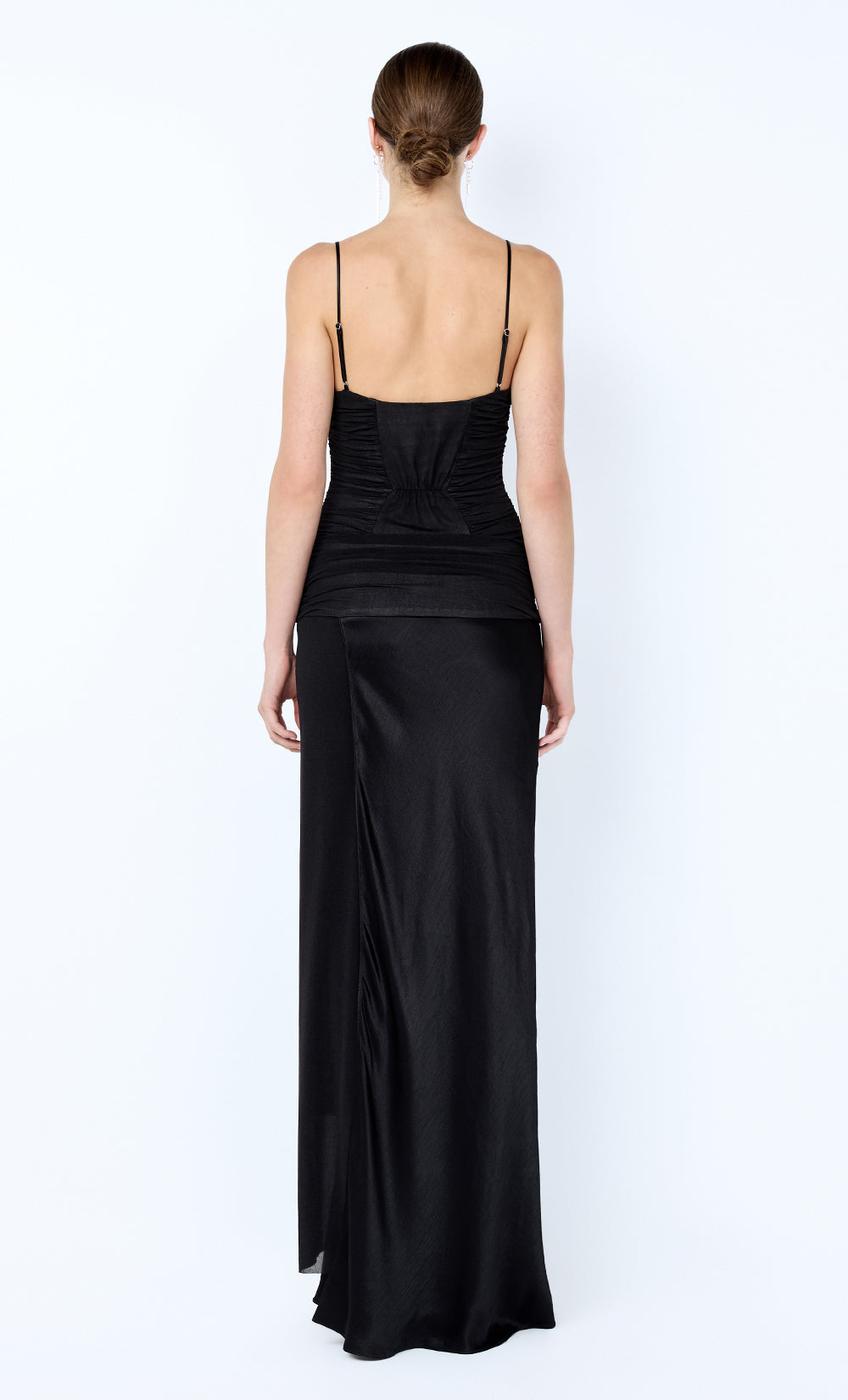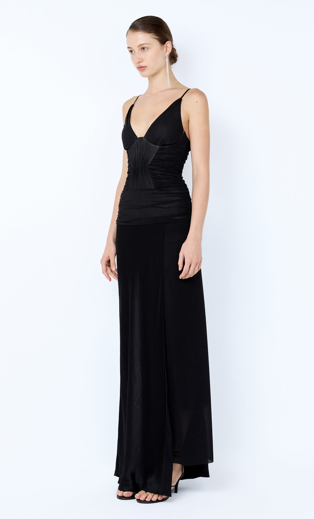 Airlie Maxi Dress in Black. A lightweight stretch-stocking maxi dress with a gathered, panelled bodice that shapes the fit. Finished with a gathered yoke flowing into a contrast bias-cut skirt for an elevated event look.