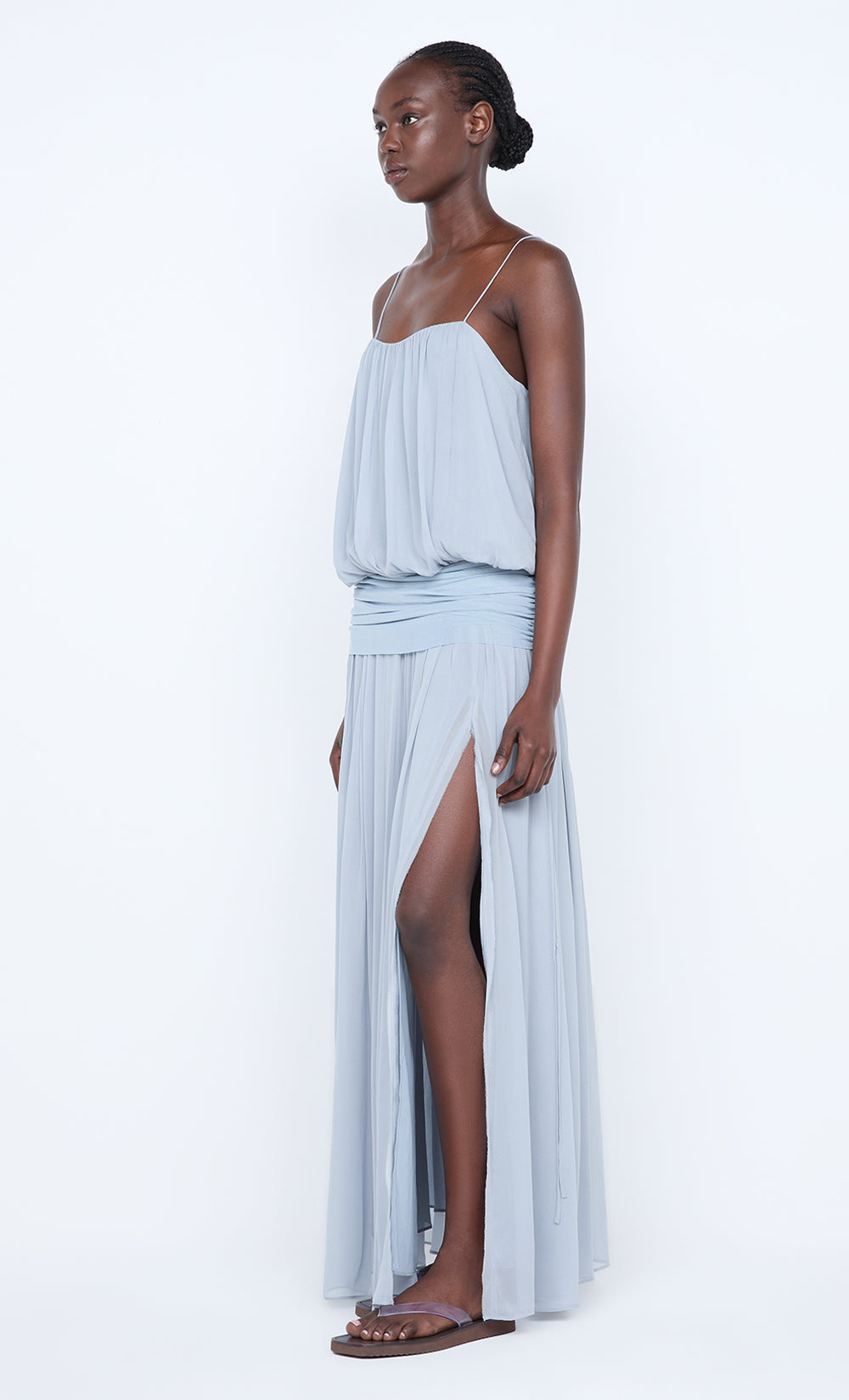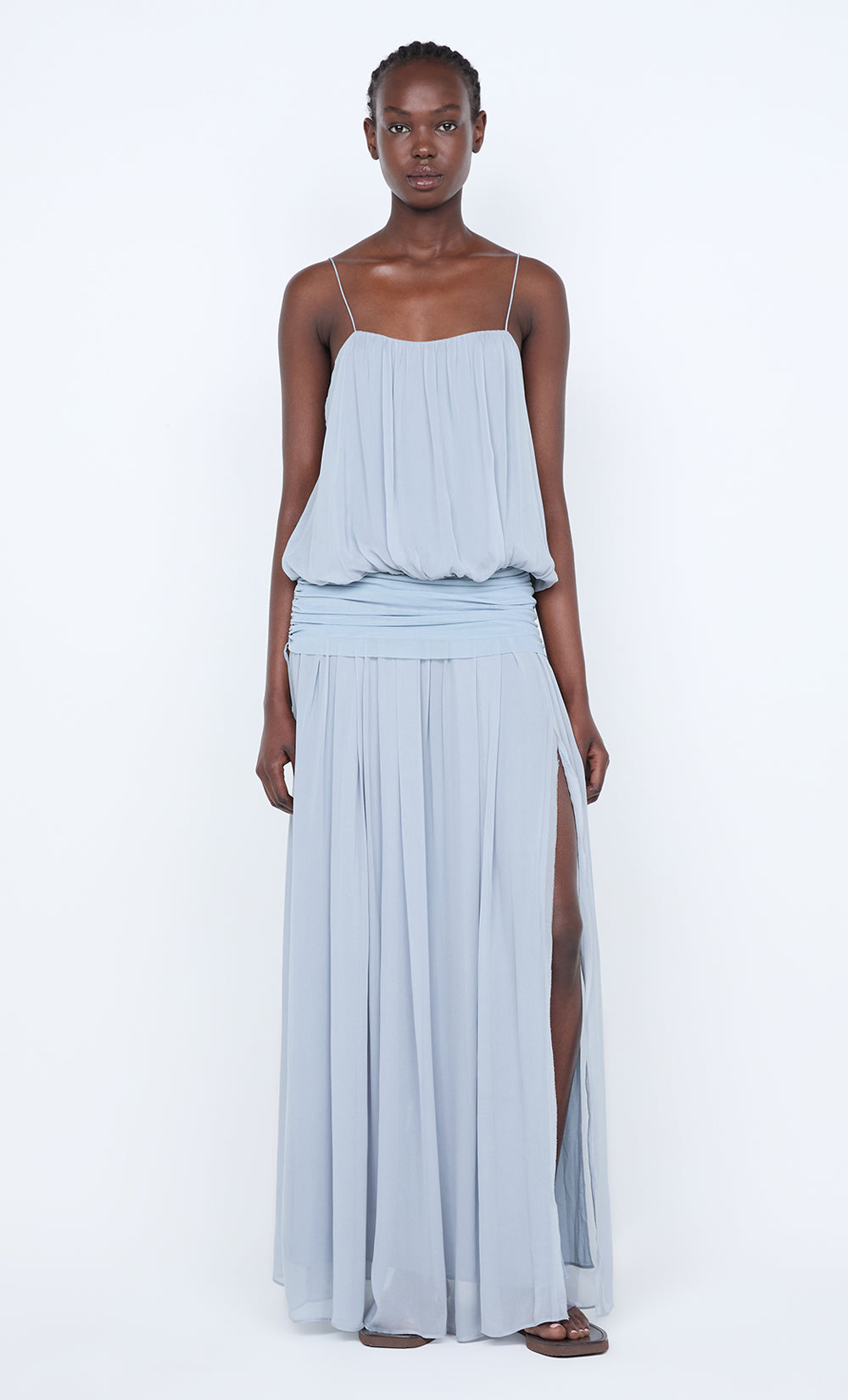 Camille Blouson Dress in Cloud Blue. This stunning maxi dress is perfect for spring dressing, whether you're looking for an elegant vacation dress, a flowing maxi for casual wear, or a beautiful wedding guest dress.