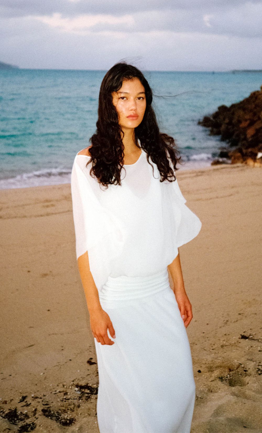 This elegant off-the-shoulder maxi dress, crafted from sheer georgette, features a flattering fit and versatile lining options, perfect for bridal celebrations, resort wear, or a wedding guest ensemble