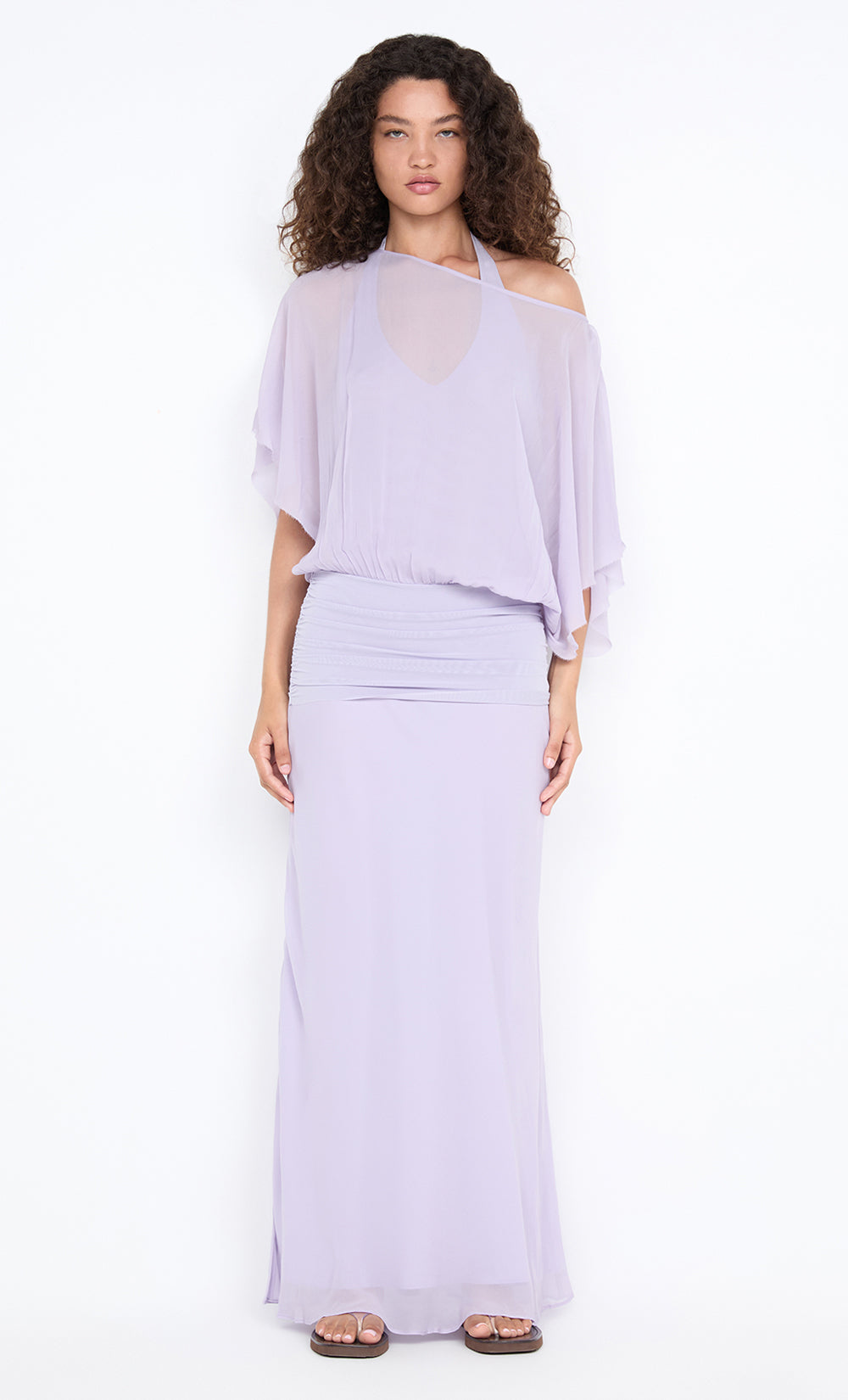 This elegant lilac off-the-shoulder maxi dress, crafted from sheer georgette, features a flattering fit and versatile lining options, perfect for bridal celebrations, resort wear, or a wedding guest ensemble