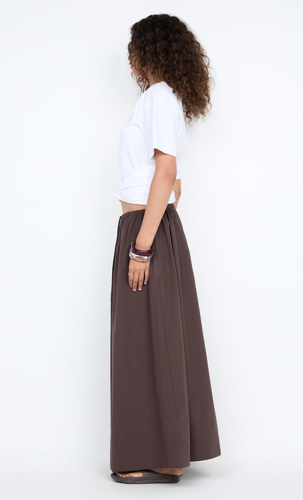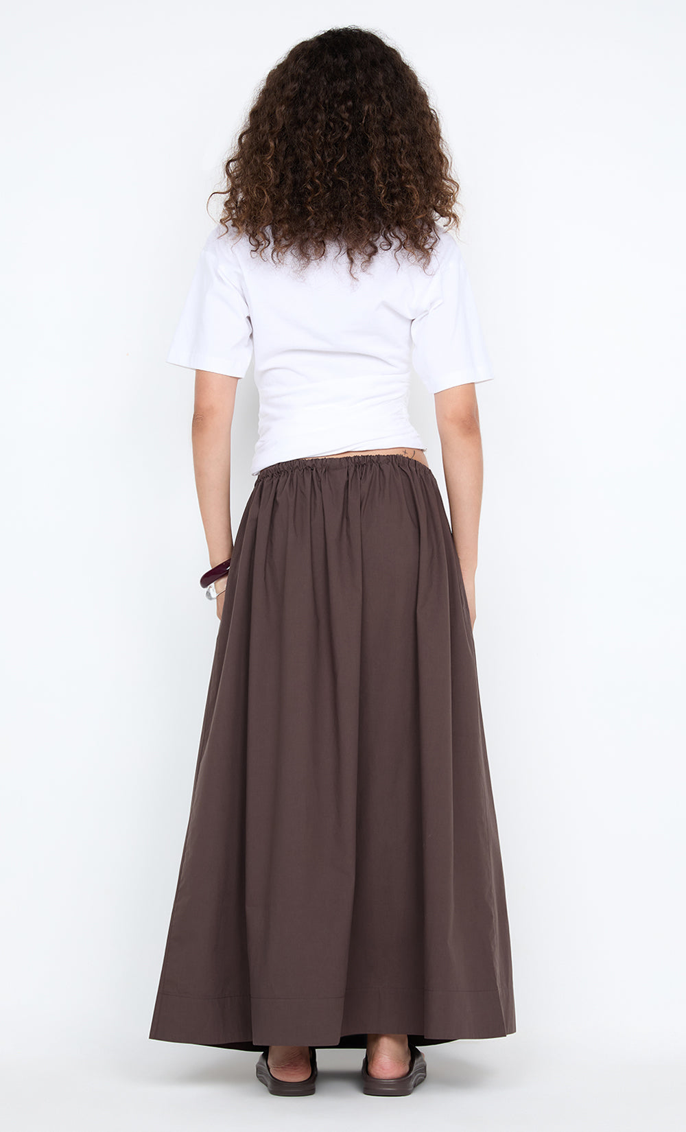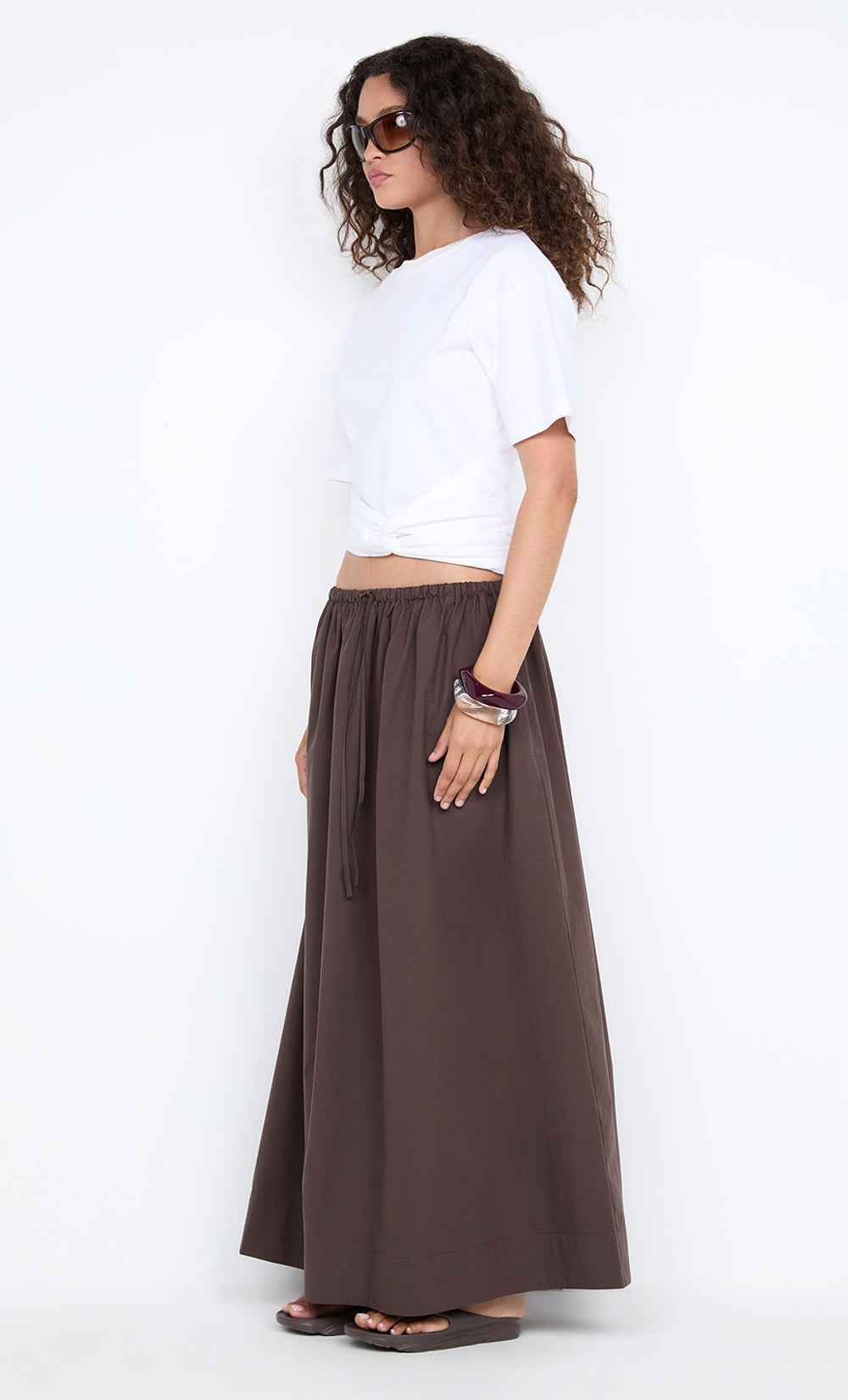 The BEC + BRIDGE Eleanor Drawcord Maxi Skirt in Choc is a chic and versatile piece crafted from breathable cotton poplin