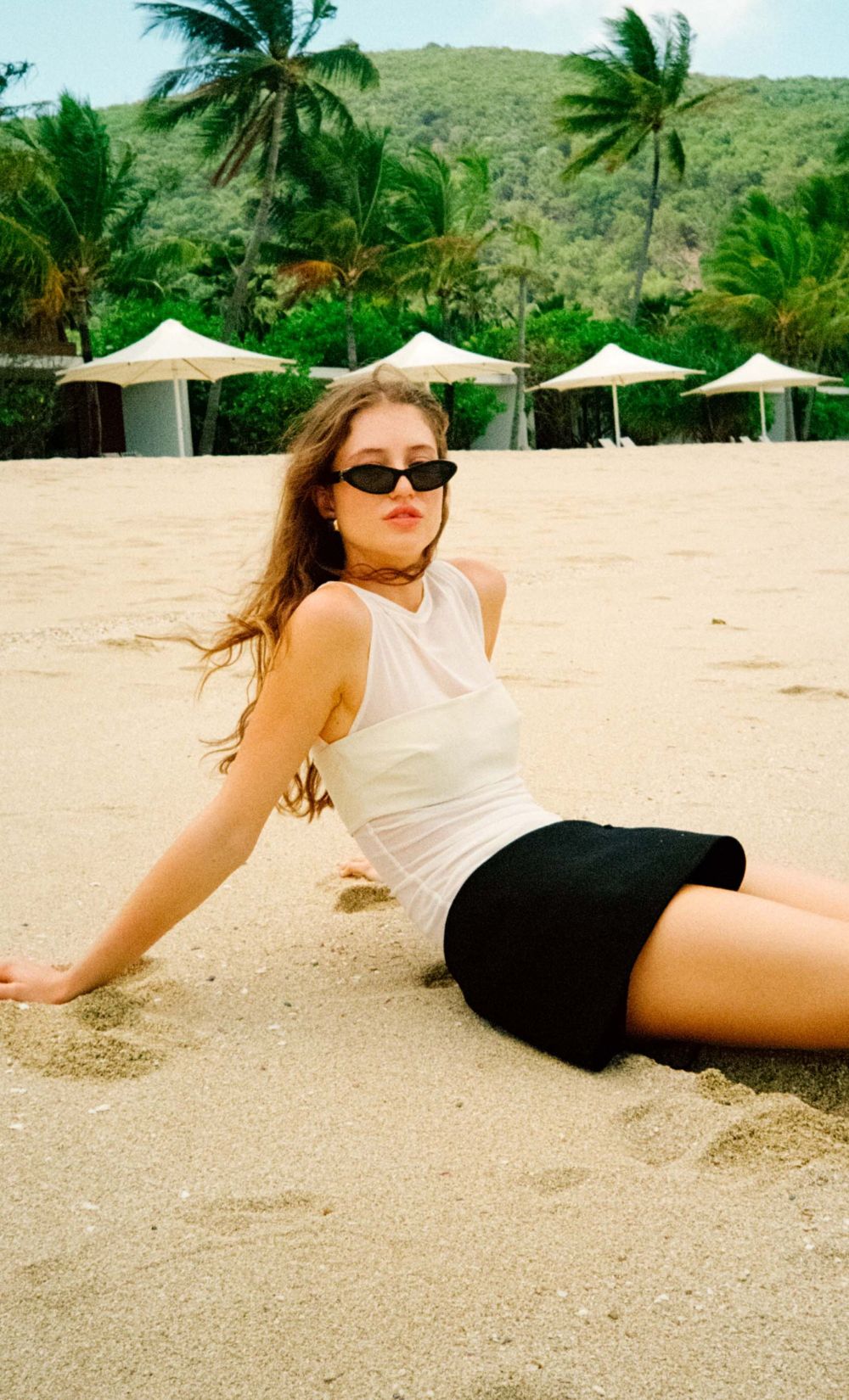 Reid Top in Vanilla. This effortless soft mesh top, with its layered bandeau bra, offers a stylish and modern silhouette perfect for elevated holiday styling or a night out.