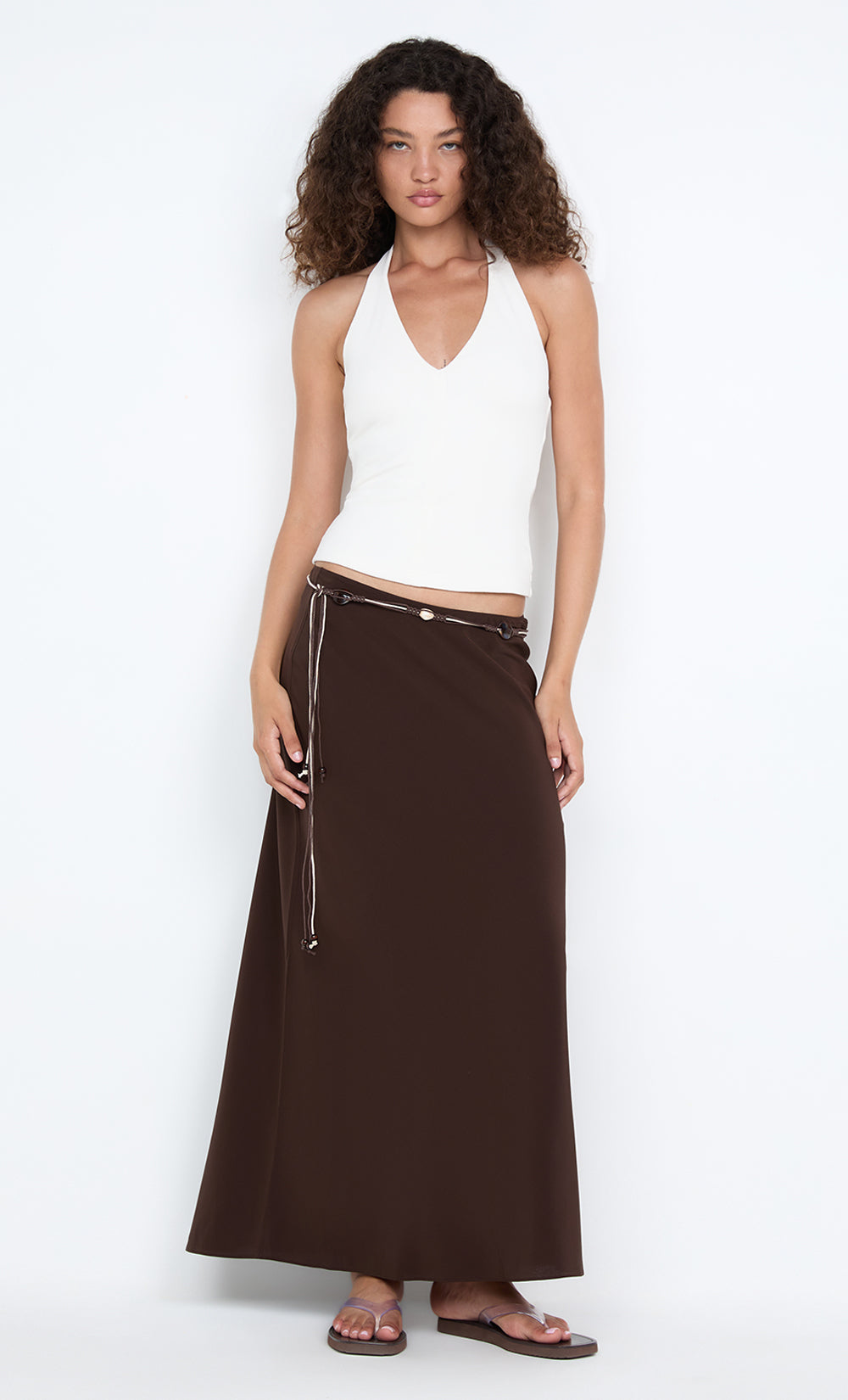 The BEC + BRIDGE Silk Bias Maxi Skirt in Chocolate is a luxurious piece cut from Silk Crepe de Chine for a smooth, flowing drape