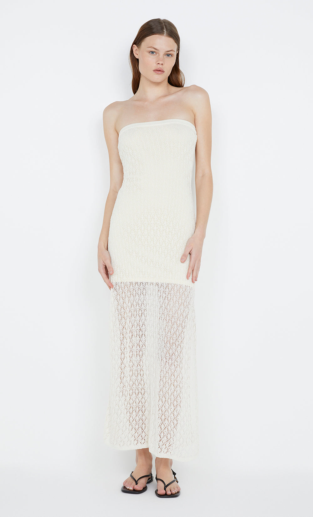 The BEC + BRIDGE Aurora Strapless Dress is made from a textured knit fabric with a layered effect. The dress is designed to hug your silhouette and elongate your body, with lining to high thigh with splits at both sides.