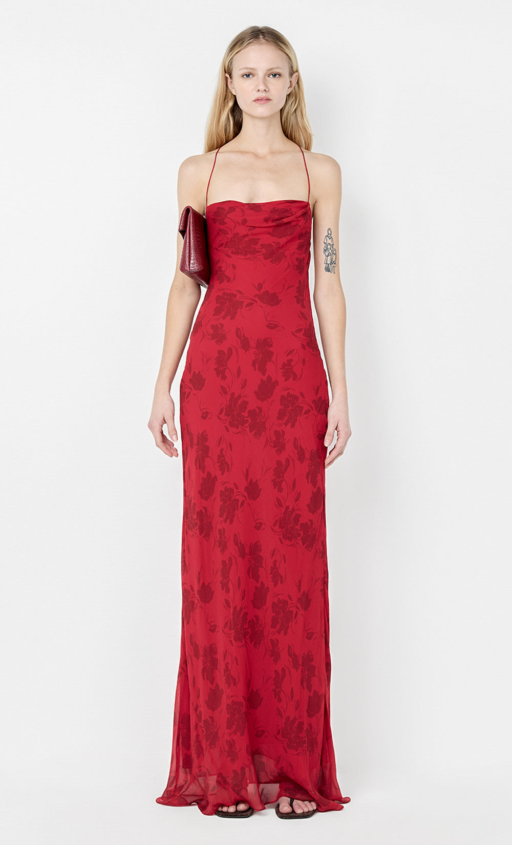 Ruby Slip Maxi Dress in Cherry Floral. This elegant bias-cut maxi dress, crafted from georgette, features a soft cowl neckline and a striking open back, creating a flattering silhouette perfect for formal events, a wedding guest ensemble, or a sophisticated night out.
