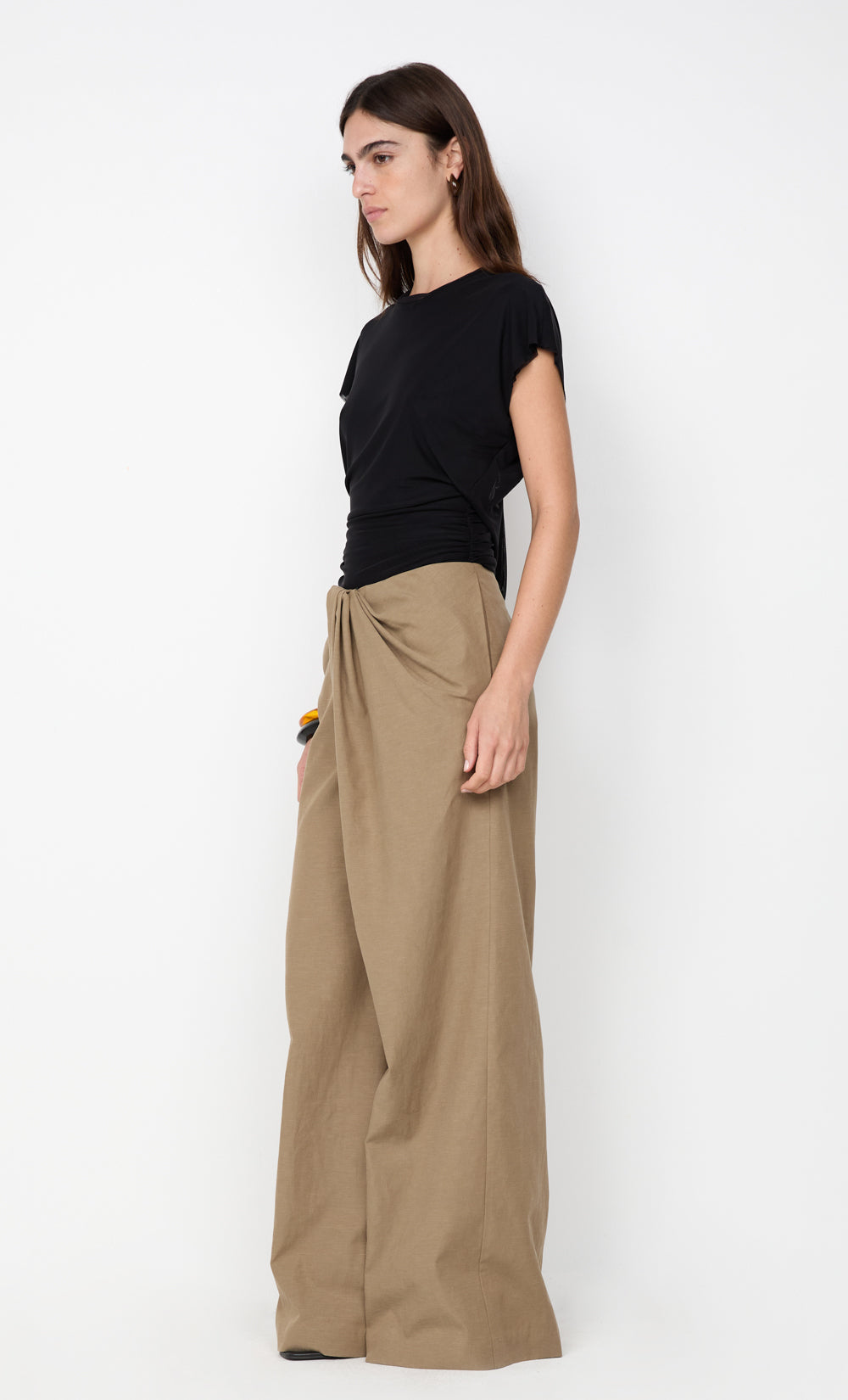 Bowen Drape Pant in Olive. These sophisticated straight-leg pants are perfect for elevated day-to-night styling or a chic evening out.