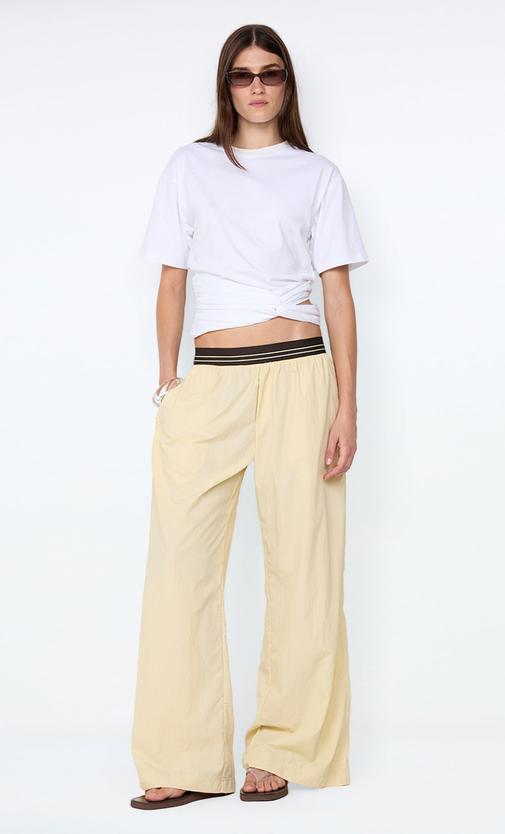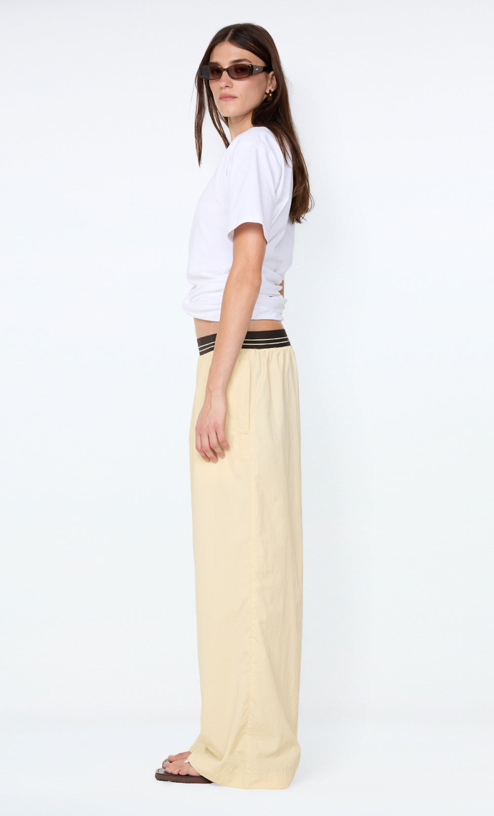 Jerri Wide Leg Pant in Butter. These effortless wide-leg pants, feature a custom stripe elastic waistband, offering a chic and comfortable look perfect for elevated holiday styling.