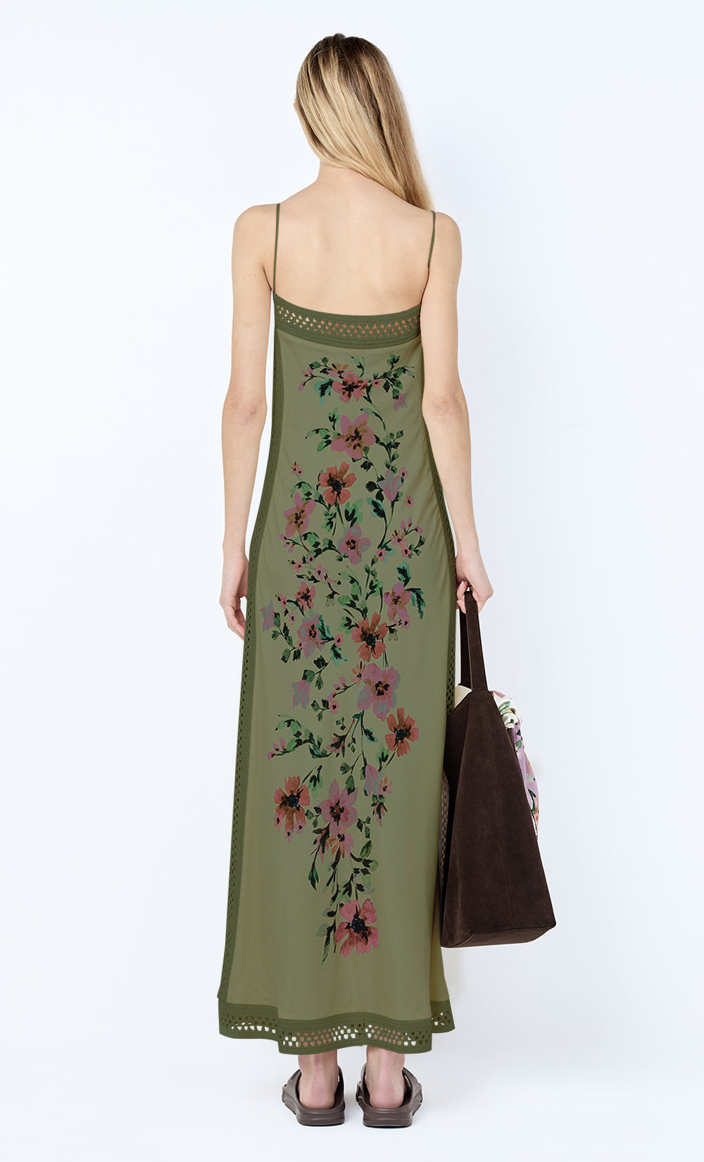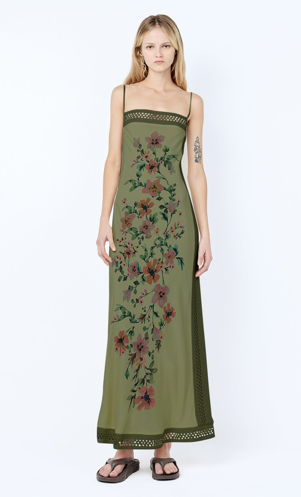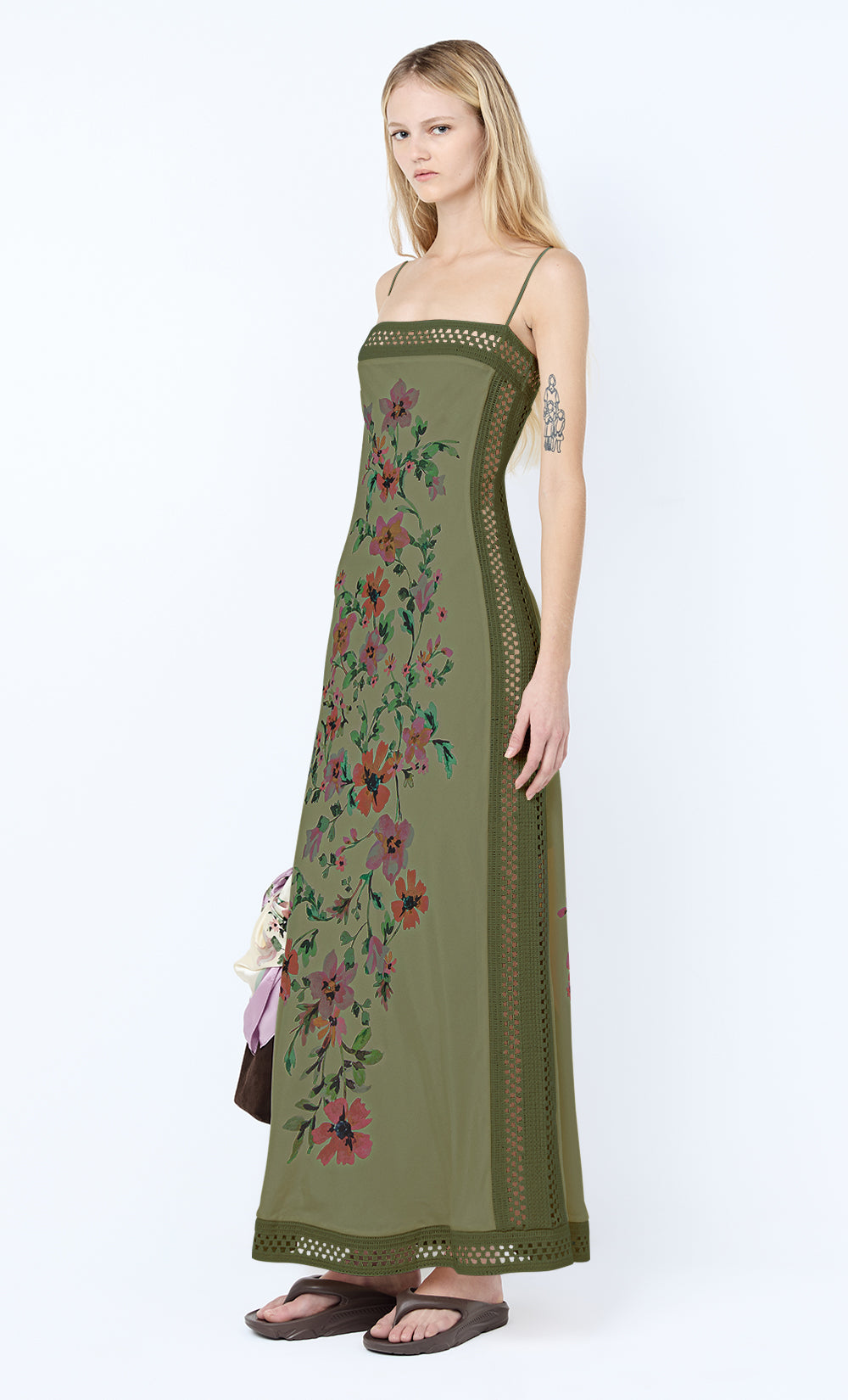 Camelia Maxi Dress in Olive. A floral printed maxi dress perfect for a summer lunch or an evening event.