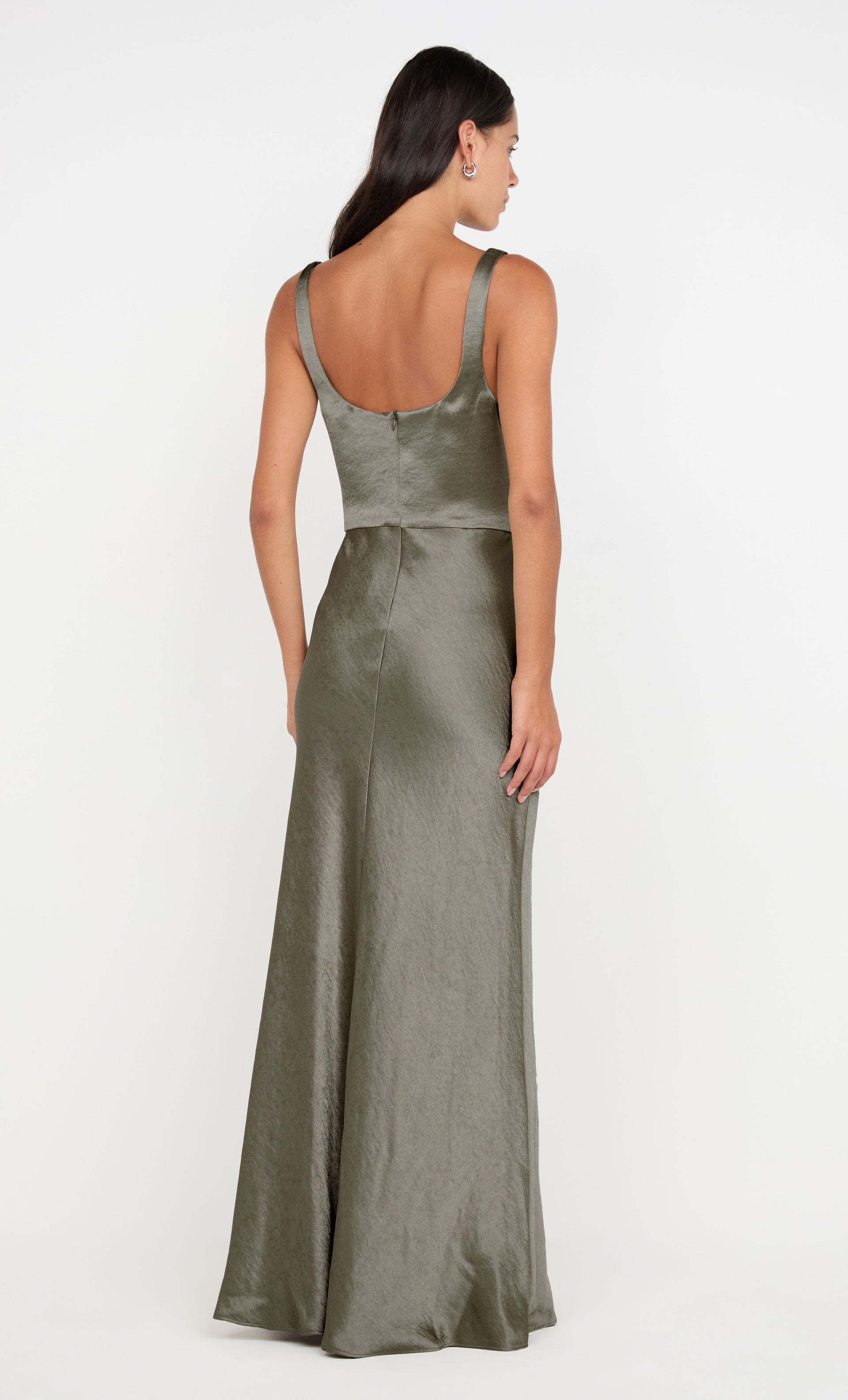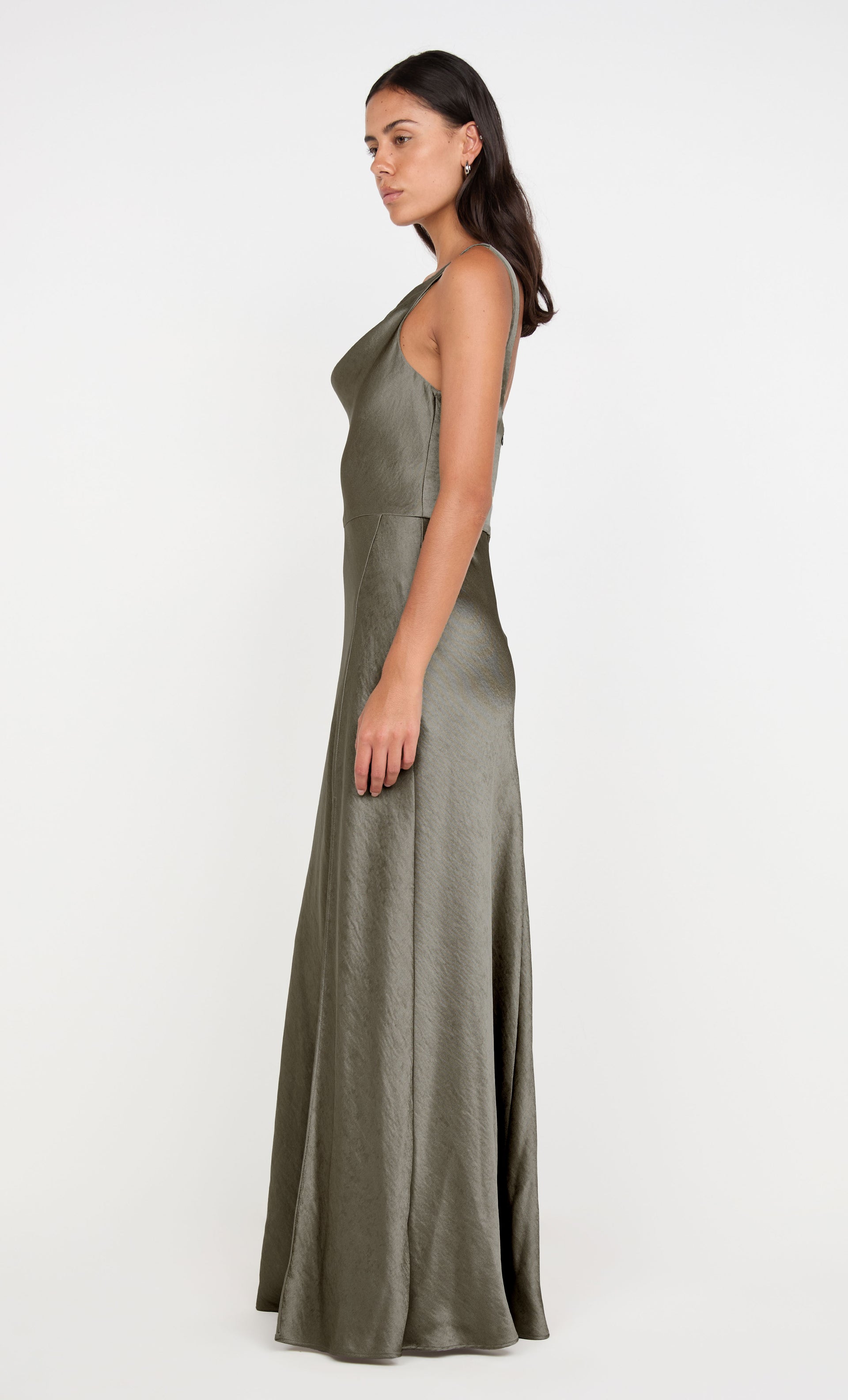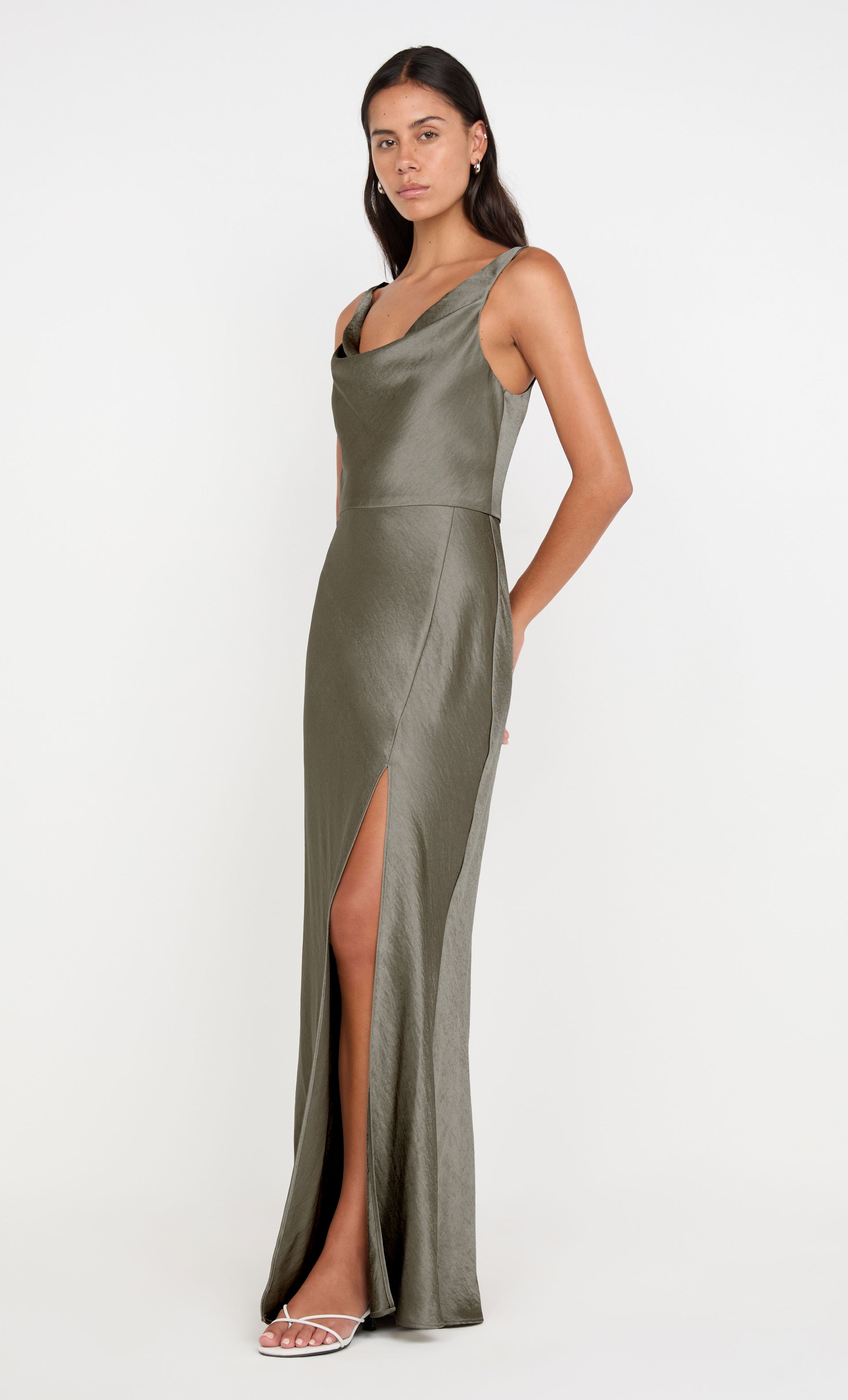 Austen Cowl Neck Maxi Dress in Dark Willow. An elegant and timeless maxi dress, crafted from mid-weight satin, featuring a soft cowl neckline and a flattering bias-cut silhouette, perfect for bridesmaids and formal events.