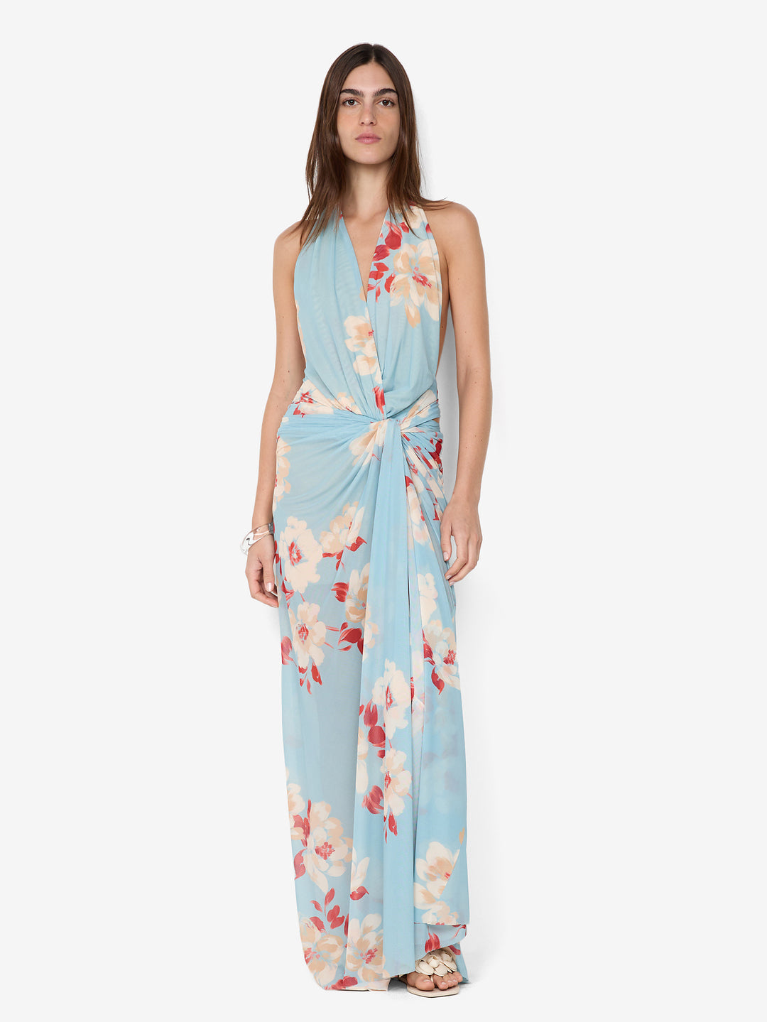 Calliope Drape Maxi Dress in Sonara. This stunning backless floral maxi dress features a dramatic front drape, perfect for an elegant night out or a glamorous event.