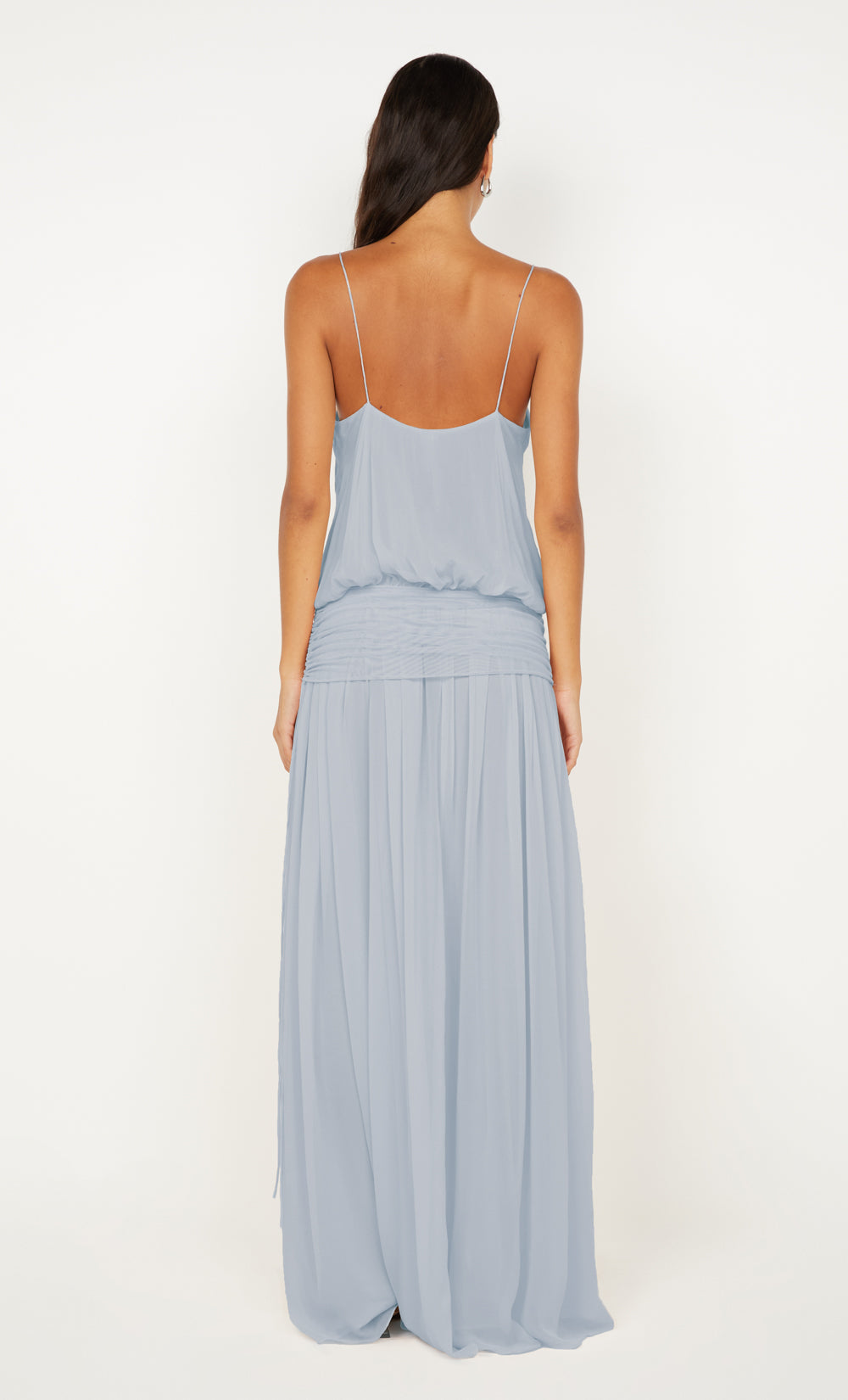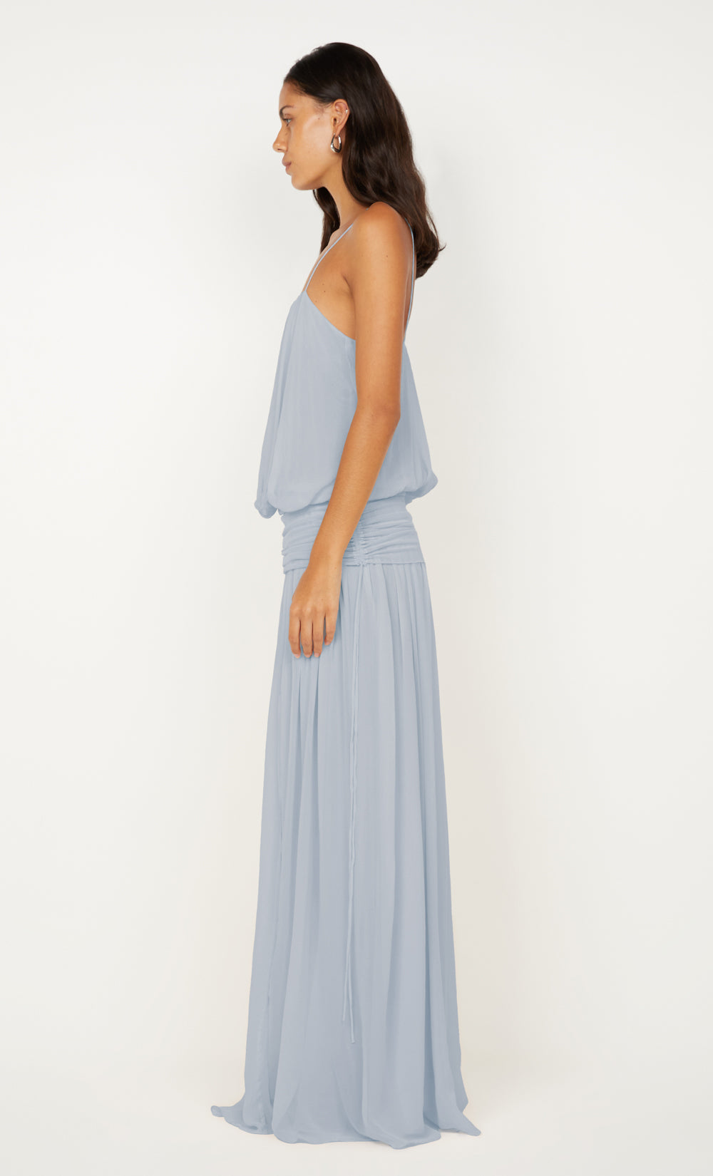 Camille Blouson Dress in Cloud Blue. This stunning maxi dress is perfect for spring dressing, whether you're looking for an elegant vacation dress, a flowing maxi for casual wear, or a beautiful wedding guest dress.