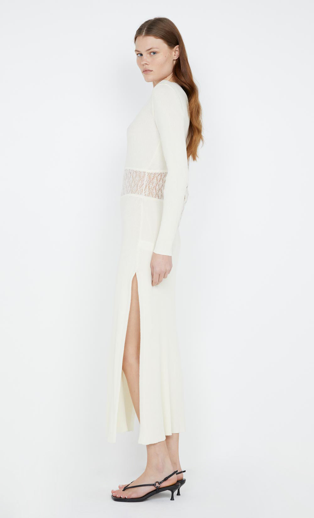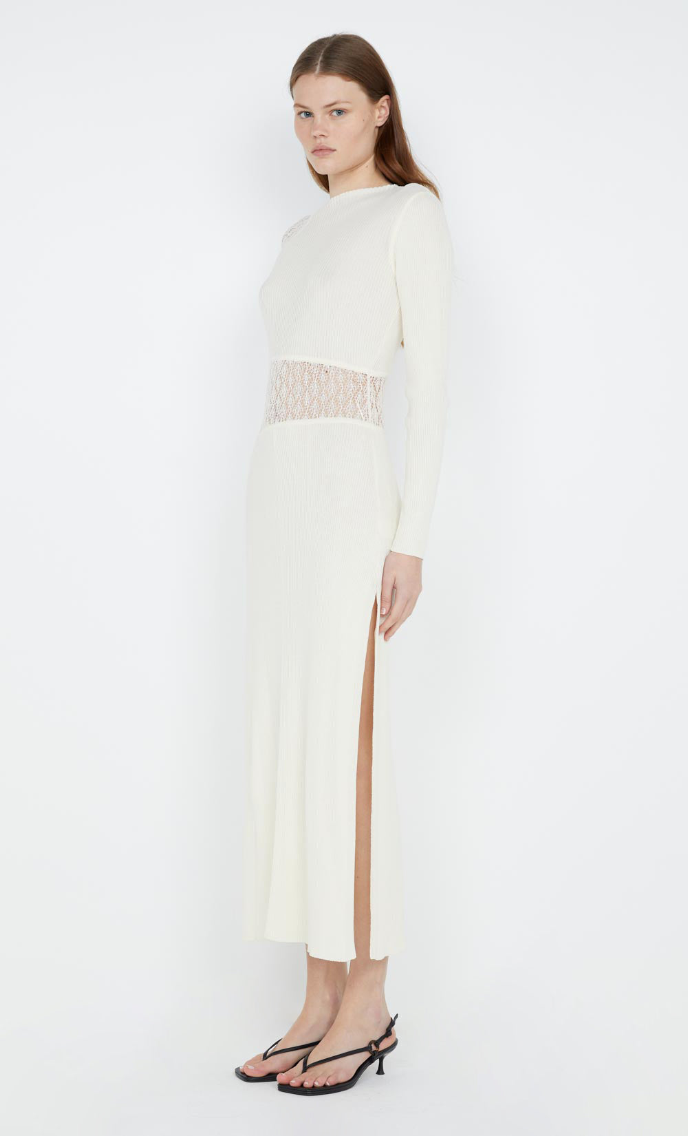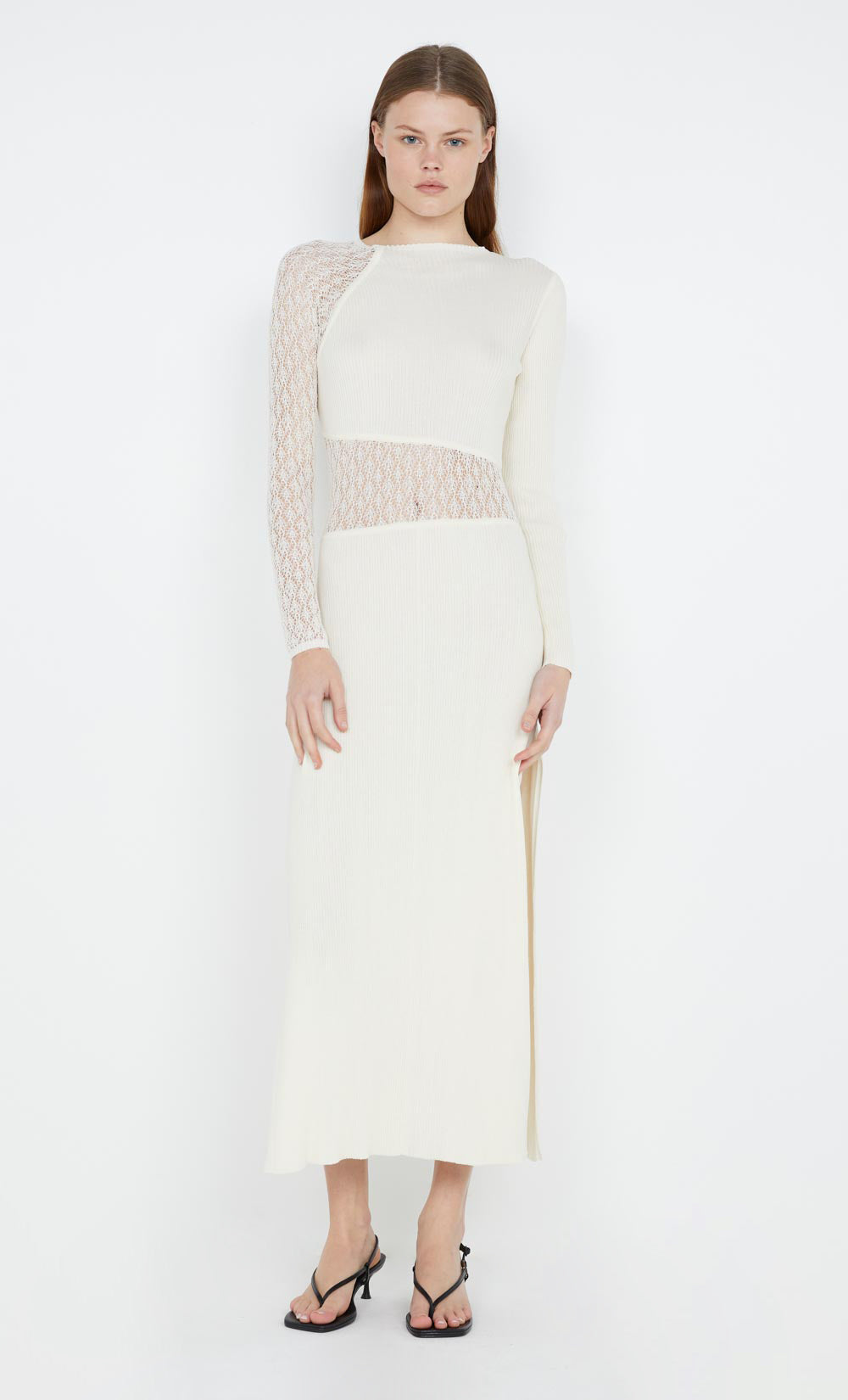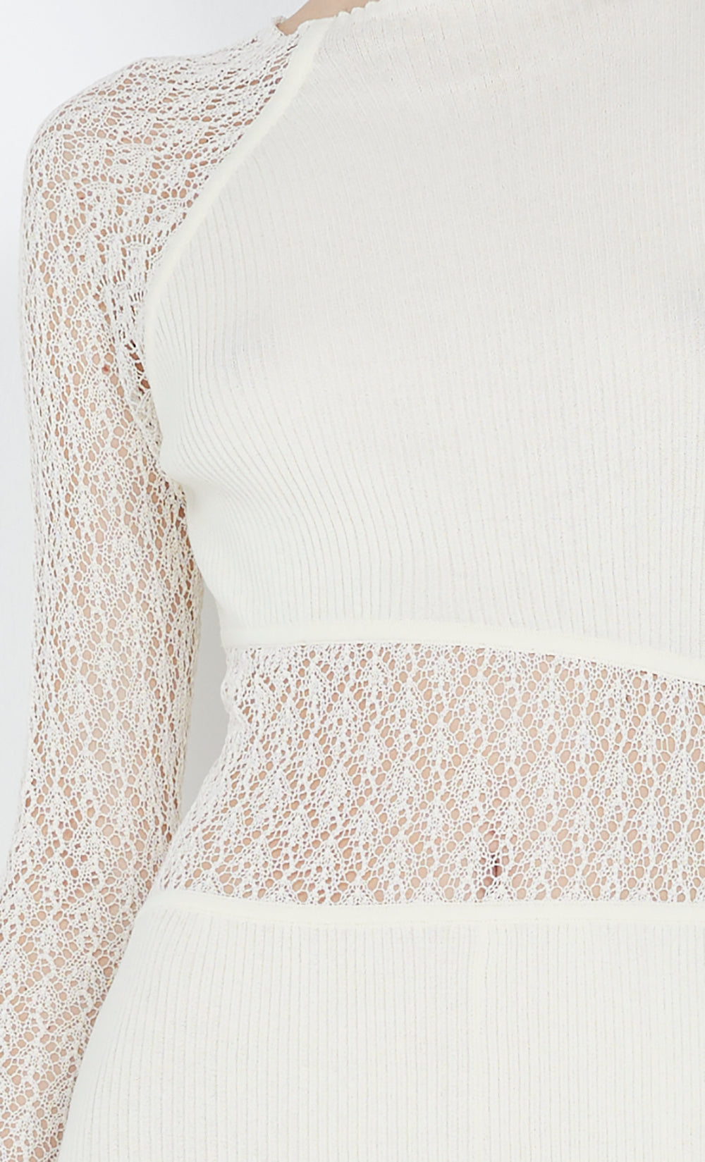 Crafted from a textured knit fabric, the BEC + BRIDGE Chantelle Long Sleeve Dress boasts a sophisticated allure with its asymmetrical detailing across the sleeve and body, adorned with intricate crocheting and ribbed contrasts. The dress features two side splits for easy movement.