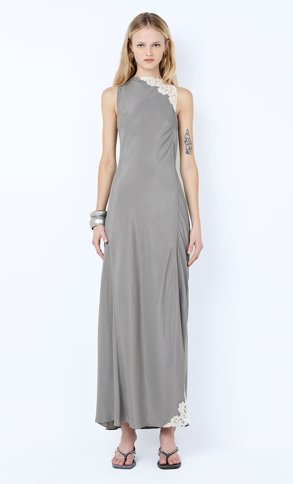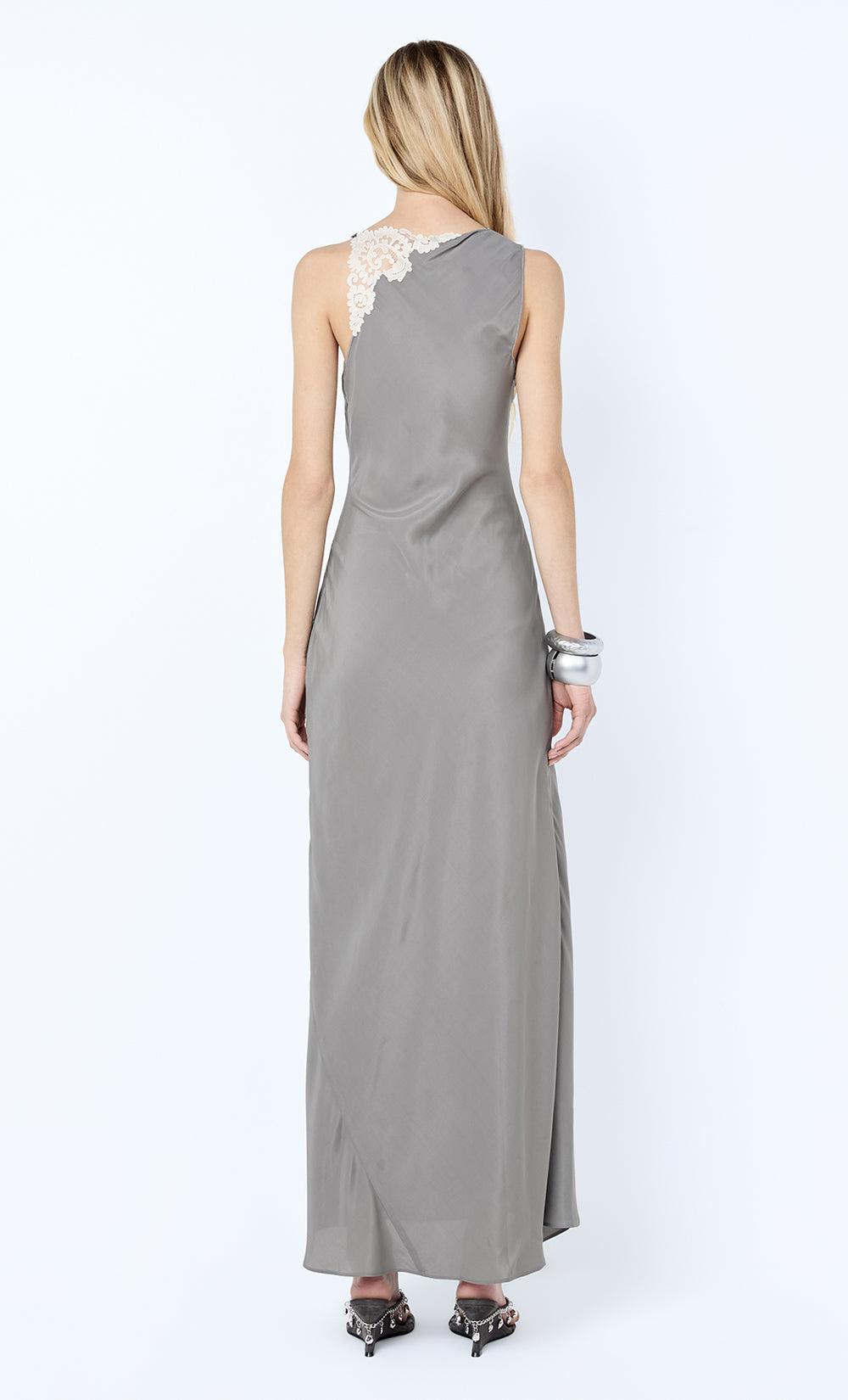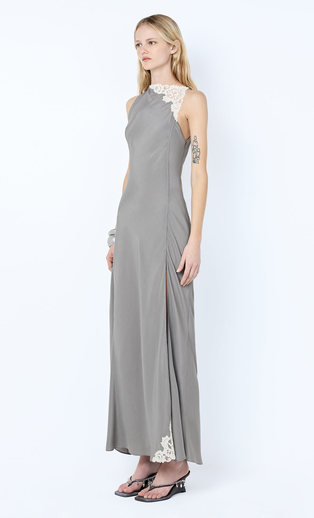 Chateau Split Maxi Dress in Slate Grey. A silk-viscose maxi dress, featuring lace detailing and an elegant front split, perfect for black tie events, a wedding guest dress, or evening styling.