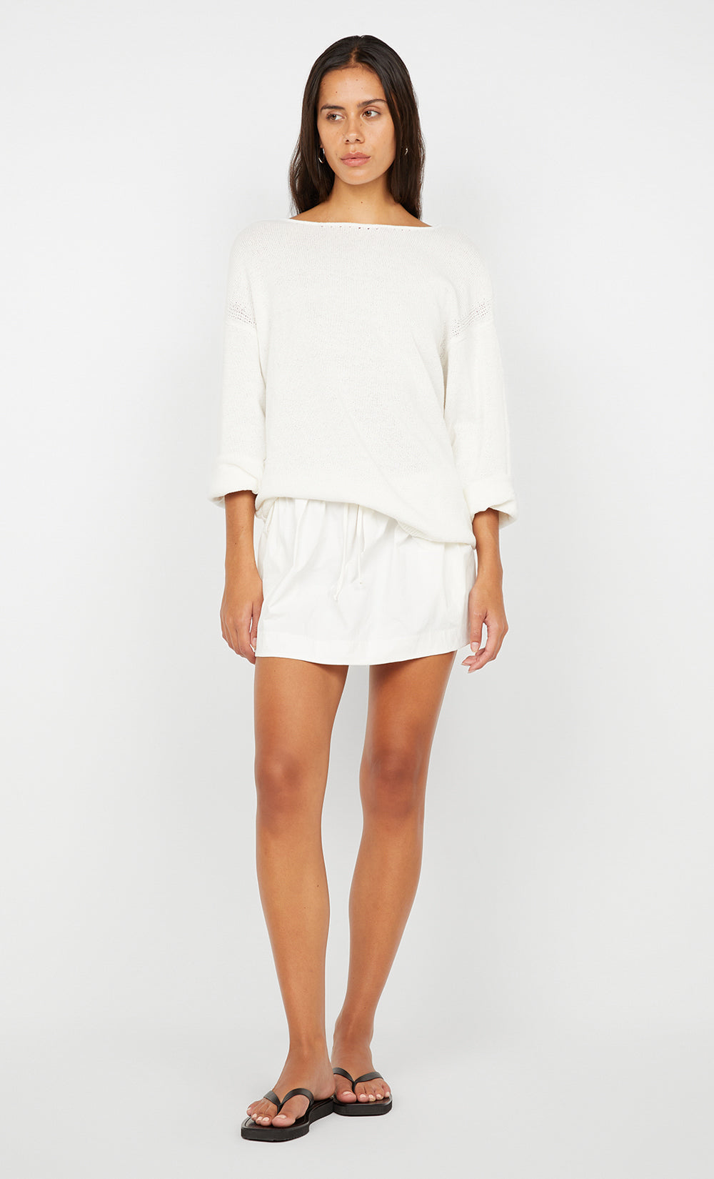 Dante Mini Skirt in Ivory. This comfortable mini skirt, crafted from stretch nylon, features a flattering gathered design and a drawstring waistband, perfect for effortless everyday styling.