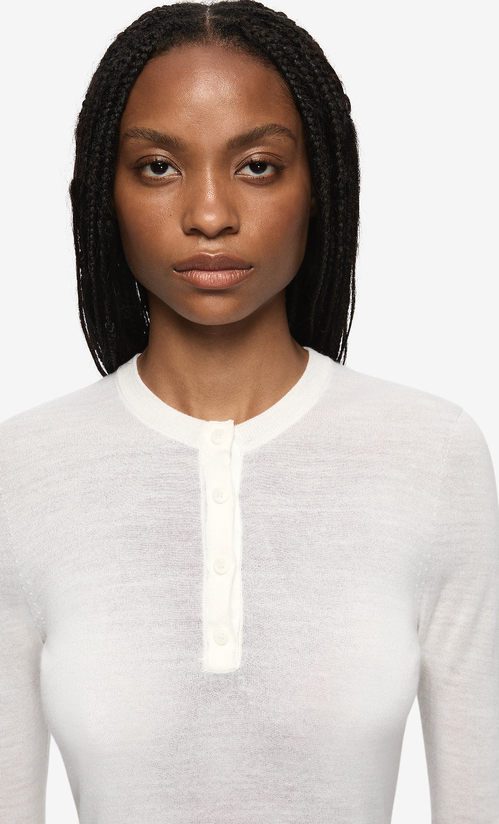Rue Long Sleeve Top in Ivory. A wool-blend long sleeve top featuring a classic crew neckline and button placket closure. Designed for elevated winter layering, casual daywear, or polished off-duty styling.