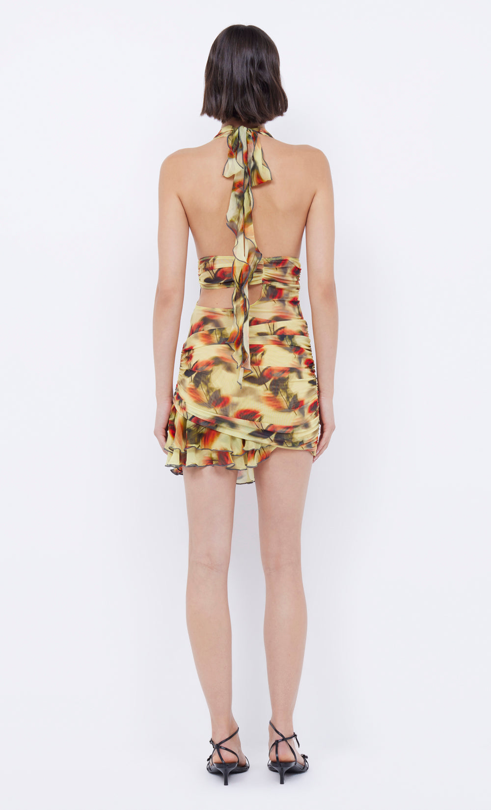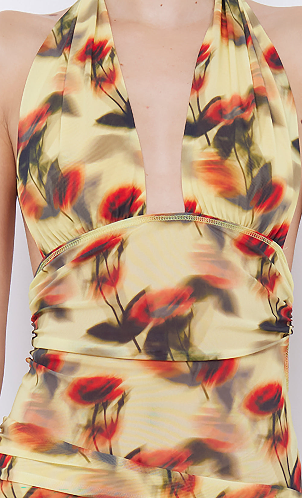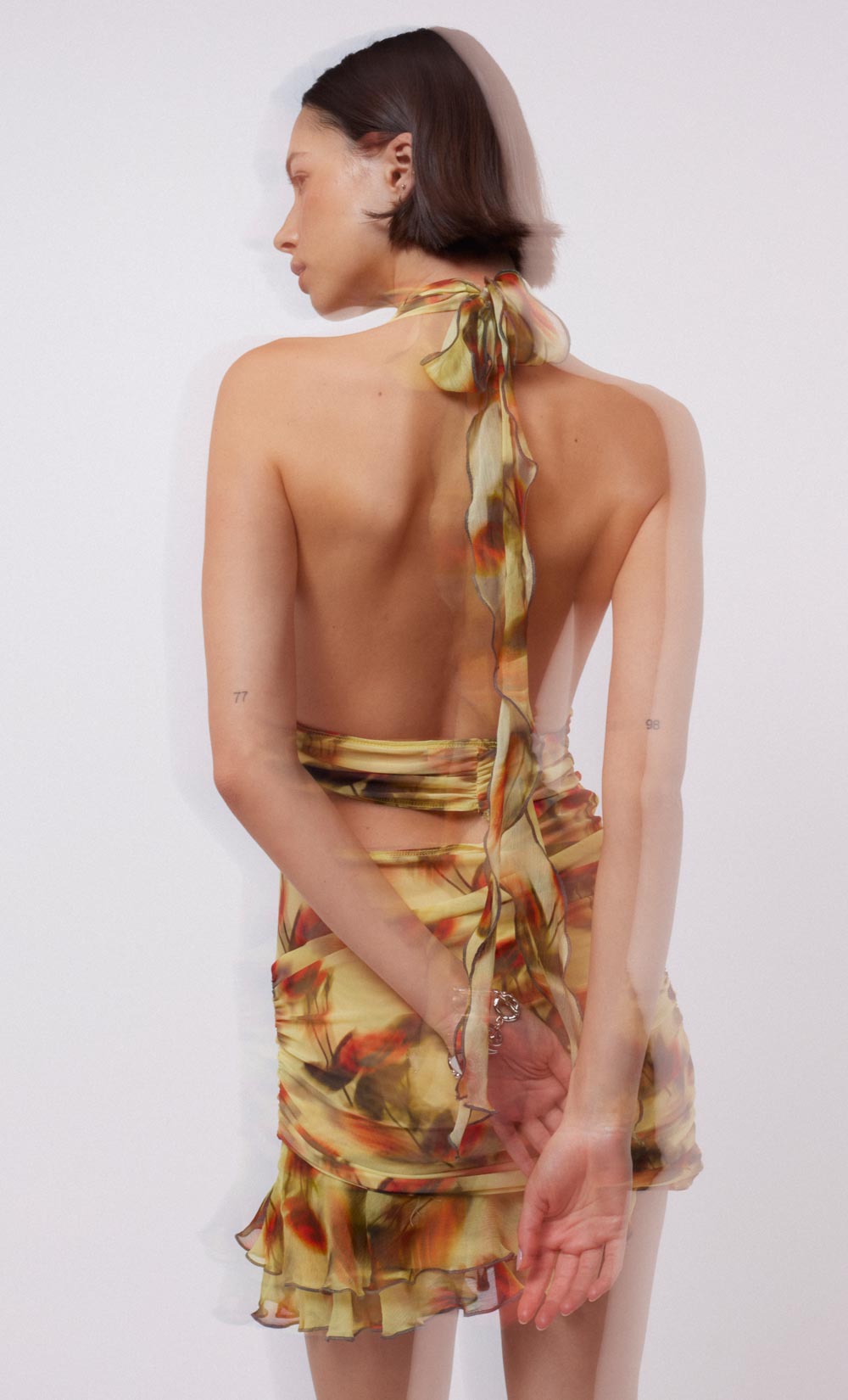 Crafted from a soft mesh sheer print fabric, the Fiore Halter Mini Dress is an bright, fun and easy-to-wear style. The mini features a thick straps that tie at the halter neck and drape at the open back with cutout detailing. The skirt section features ruched mesh layers to create a flattering shape.