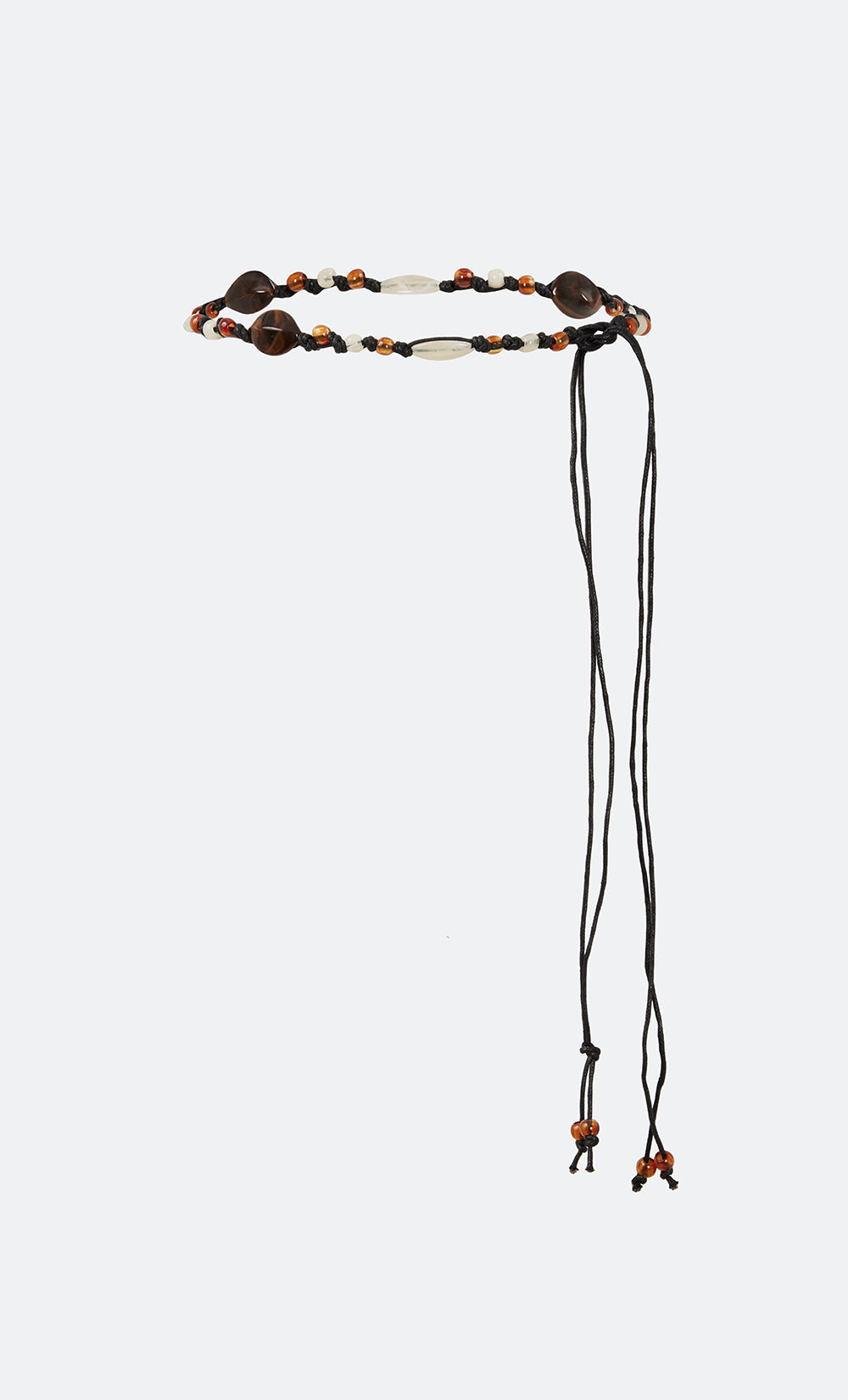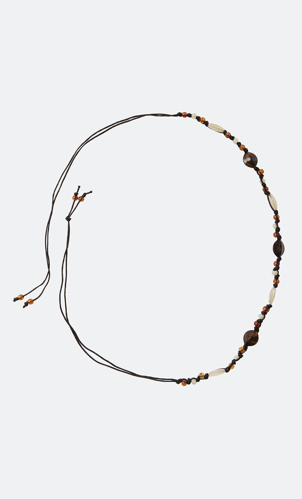 Lilla Crochet Belt in Black/Multicolour. This hand-crocheted belt, crafted from smooth waxed cotton cord, features woven resin-coloured beads throughout and adjustable tie ends, making it a versatile accessory to layer over dresses, swimwear, or denim for a polished bohemian accent.