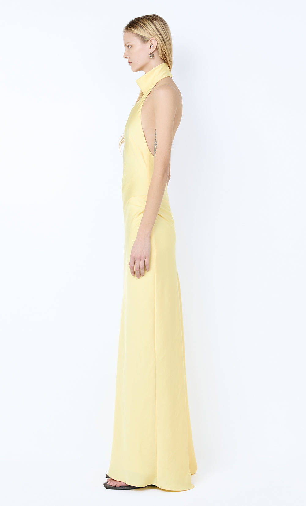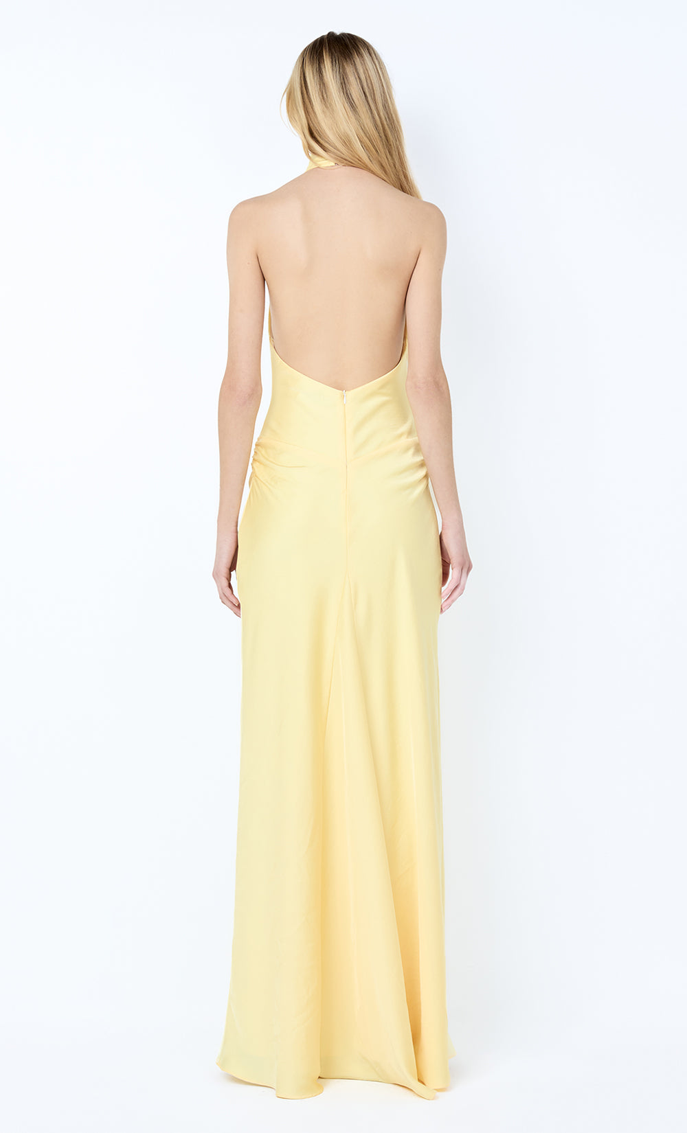 Lisette Halter Maxi Dress in Citron. A signature yellow maxi dress with a high neck, and flattering backless design, perfect for formal events or special occasions.