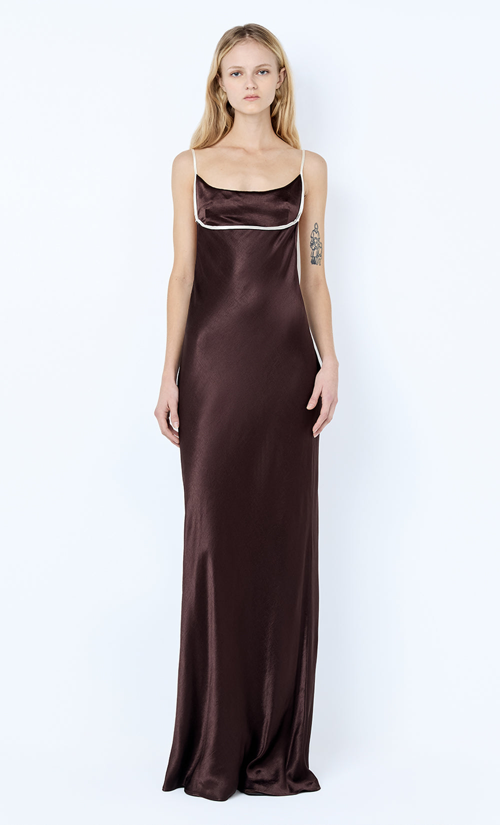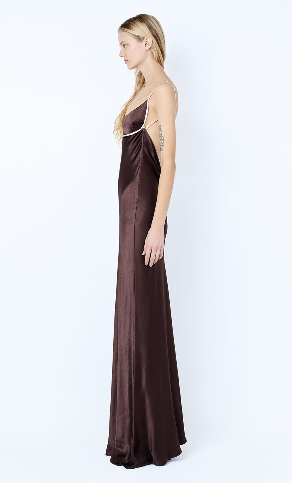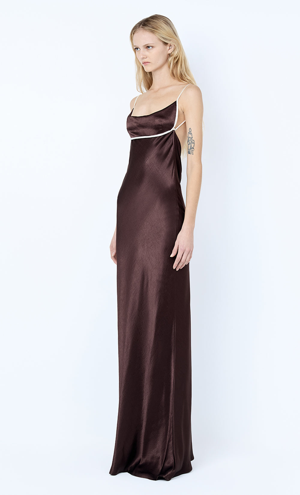 Marcy Cowl Maxi Dress in Dark Choc. An elegant maxi dress perfect for evening events, weddings or cocktail occasions.